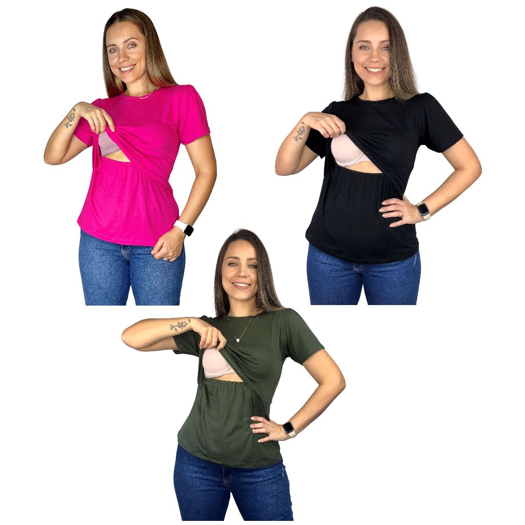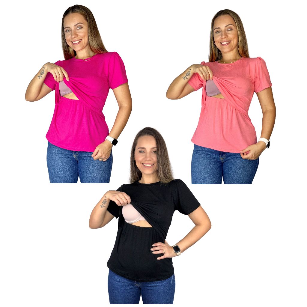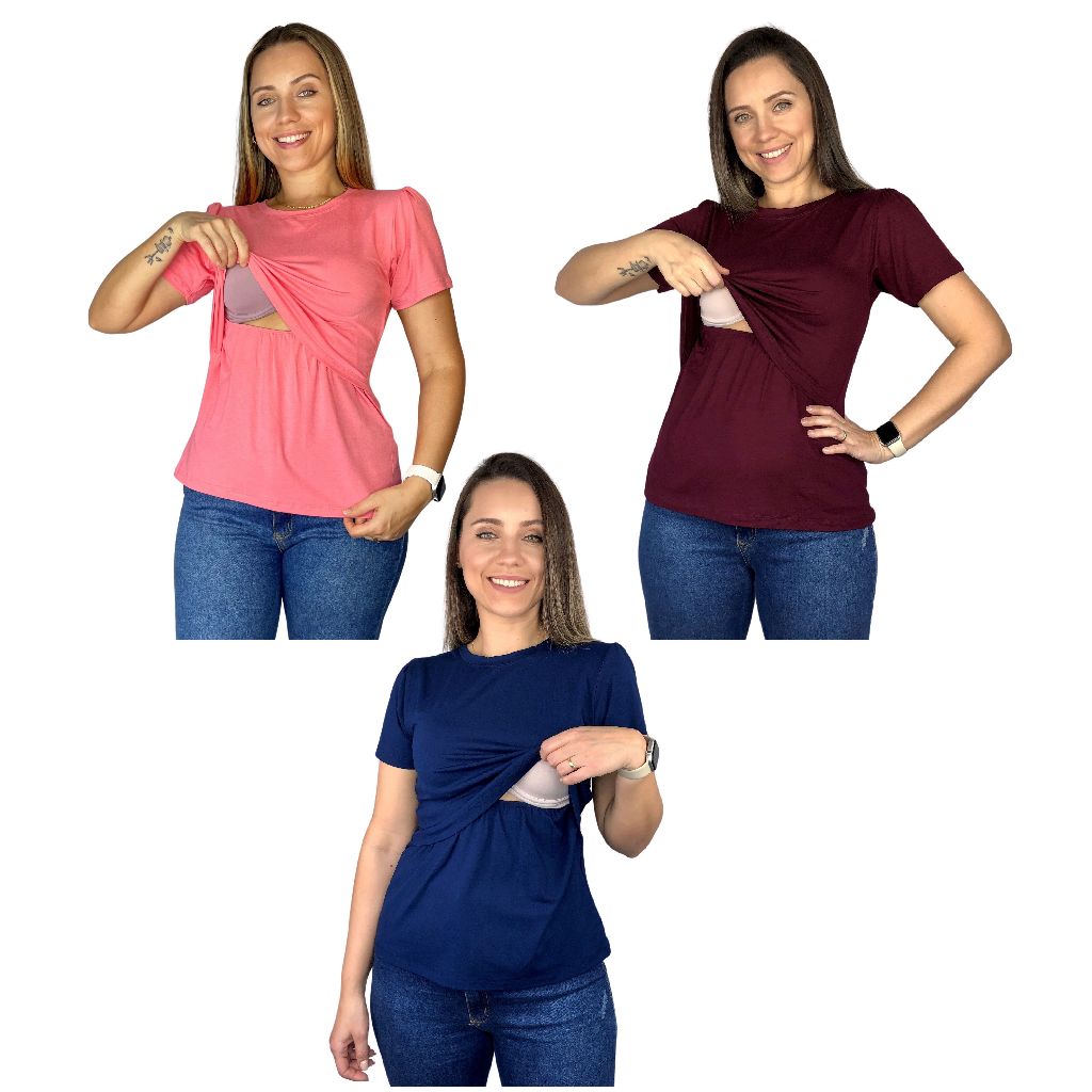 Kit 3 Blusa Amamentação Diversas Cores Viscolycra Premium Camiseta Manga Curta Gestante Grávida