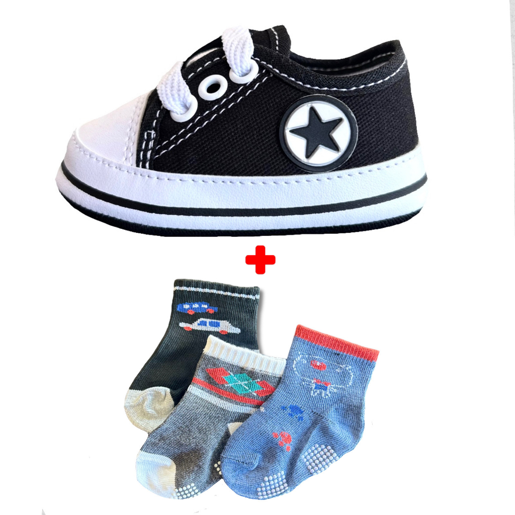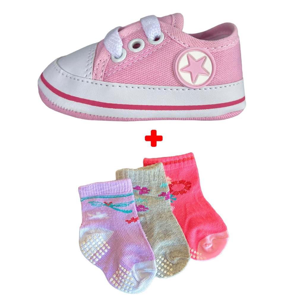 Kit Tênis Sapatinho e 3 Pares Meias para Bebê Recém Nascidos Menino e Menina Infantil Cano Baixo