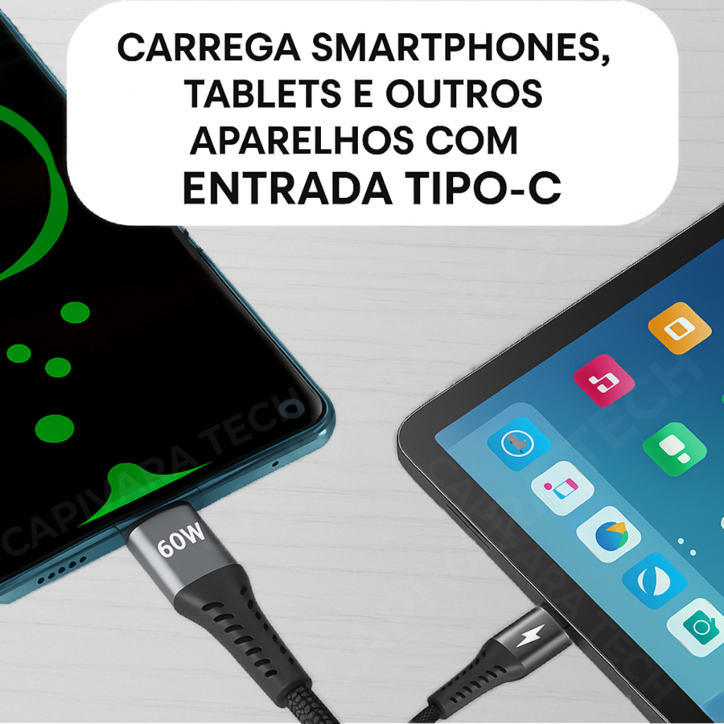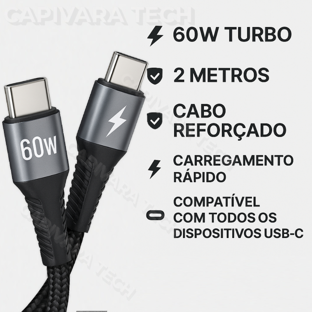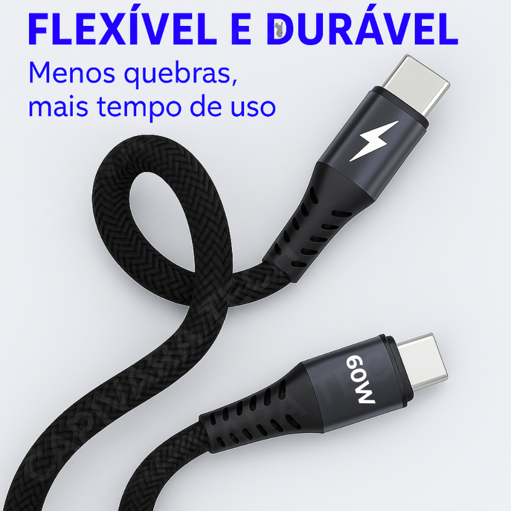 Cabo USB Tipo-C x Tipo-C 60W Turbo 2 Metros Reforçado – Rápido, Durável, Compatível com Tudo
