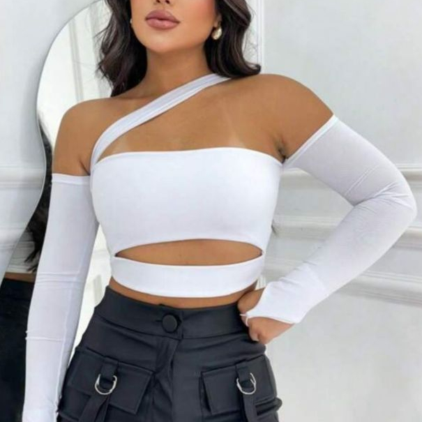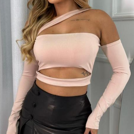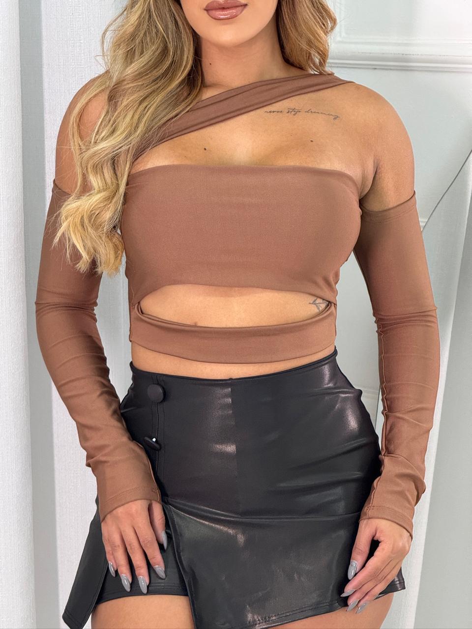 Cropped Maya Recortes Faixa Manga Longa Moda Blogueira Gringa com Bojo Feminina Decotado Ombro a Ombro