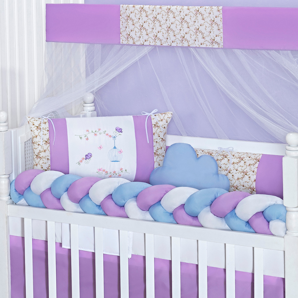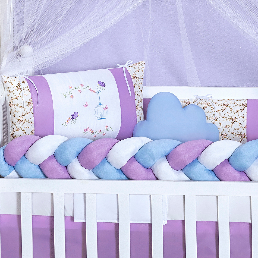 Kit Berço Trança Jardim Encantado Passarinho Lilas Azul Cores Vivas Nuvem Completo Slim 11 Peças