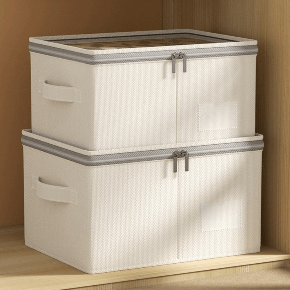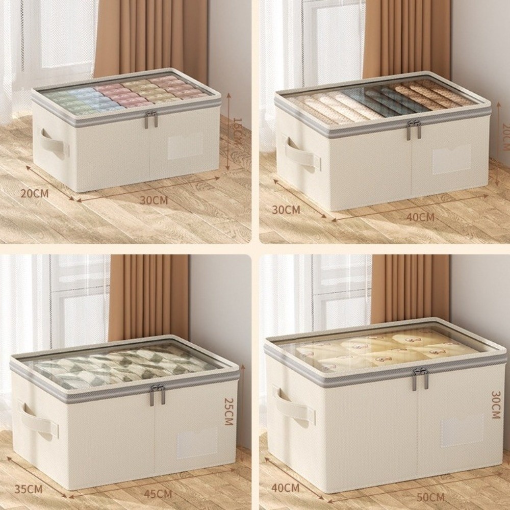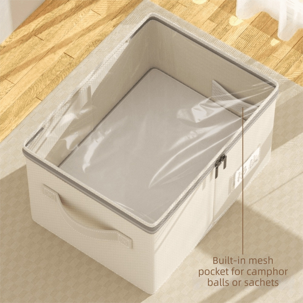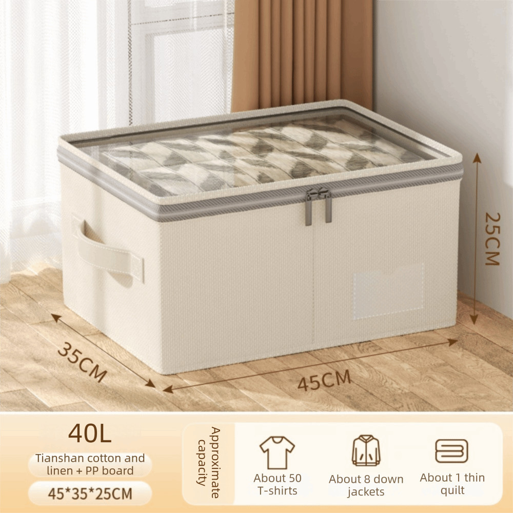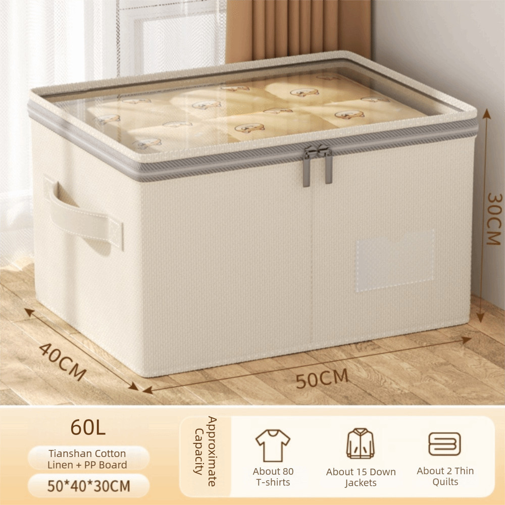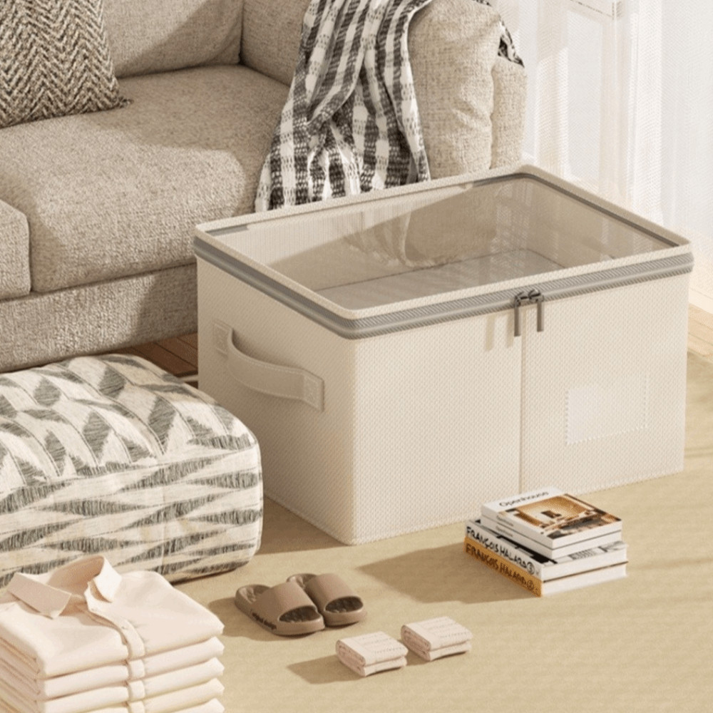 Caixa Organizadora Multiuso com Zíper e Alça – Organizador de Roupas em Algodão e Linho com Janela Transparente Grande
