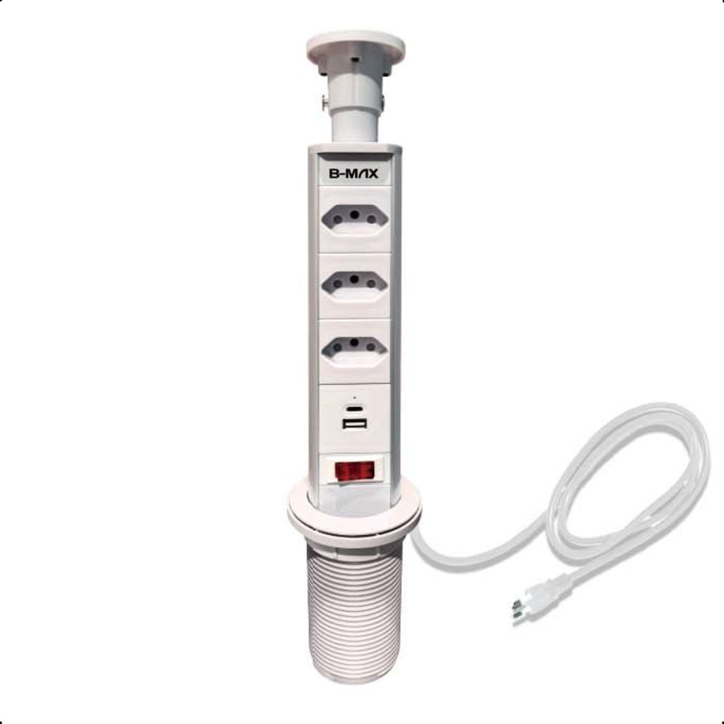 Torre De Tomada Para Bancada Embutir Retrátil Multiplug Com 3 Tomadas 10a/20a E 1 Usb E Tipo-c 110v/220v Branco B-max