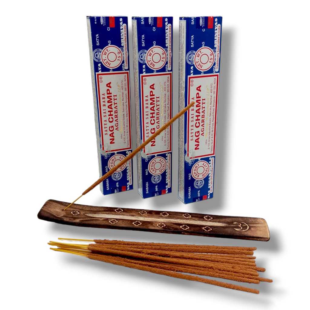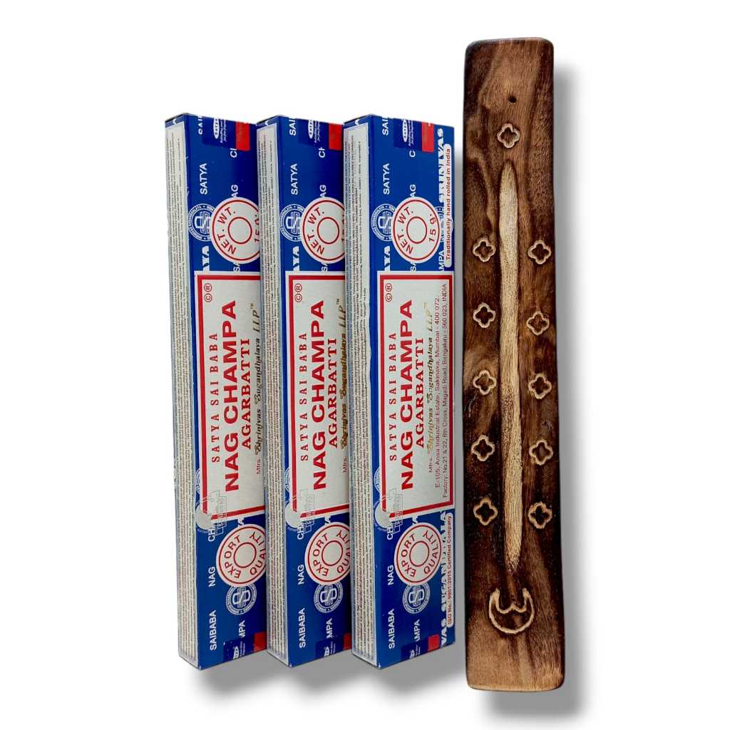 Kit 3 Incensos Satya Massala Nag Champa Sai Baba + Incensário Madeira
