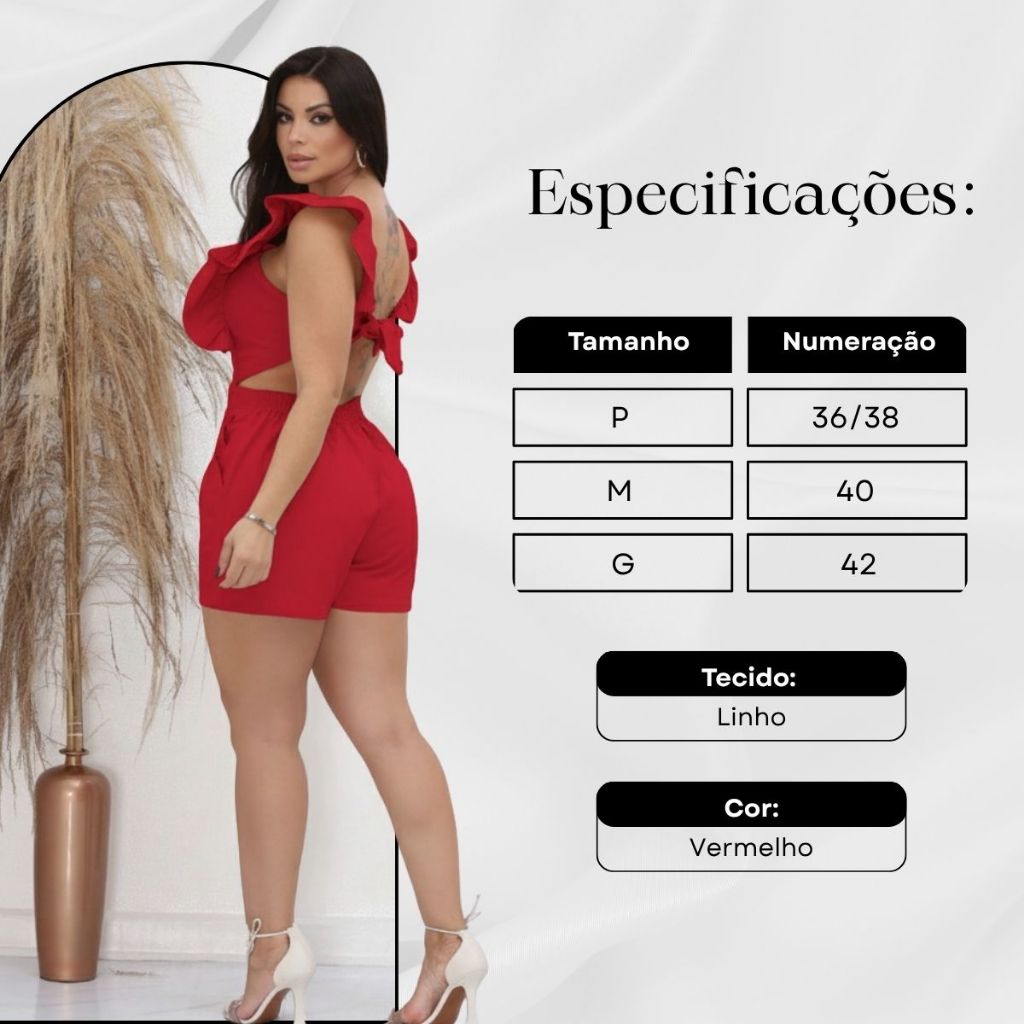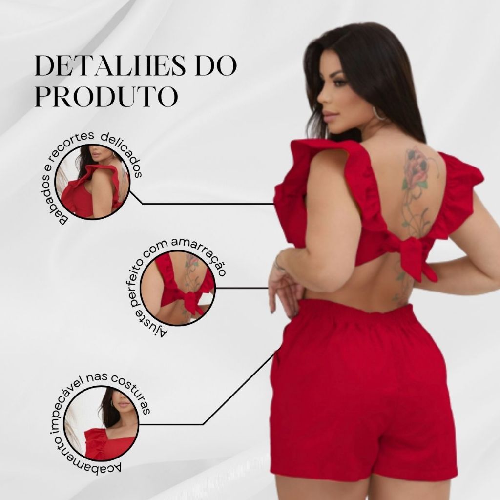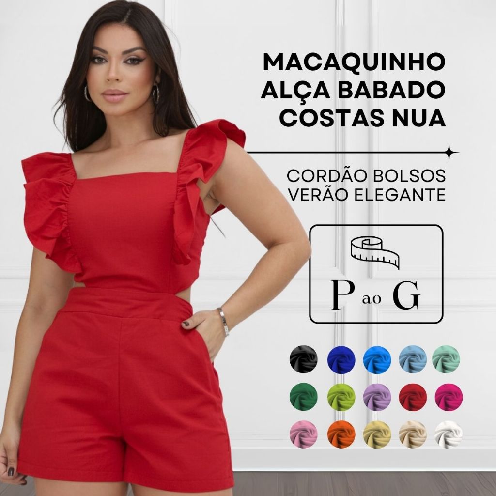 Macaquinho Feminino Alça Babado Costas Nua Cordão Bolsos Verão Elegante Casual Moda Gringa