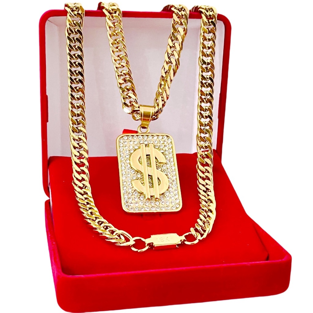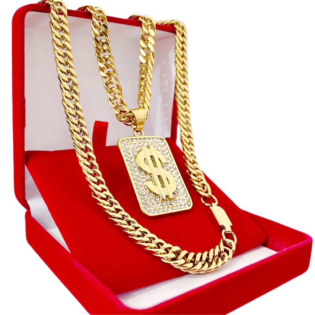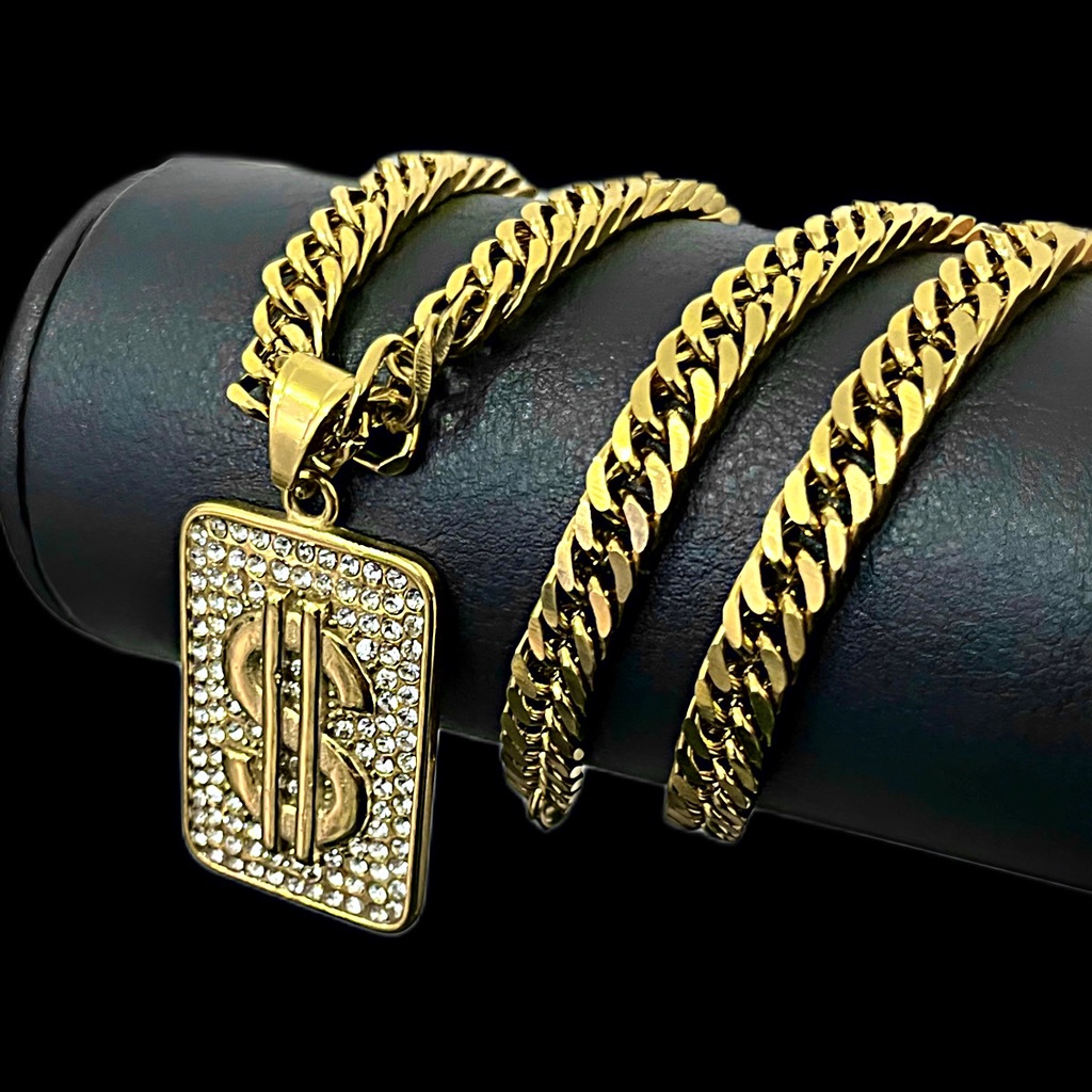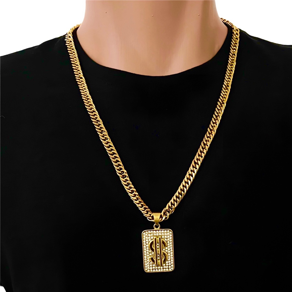 Cifrão Cravejado + Corrente Elos Duplos Grossa Banhado a Ouro 18k