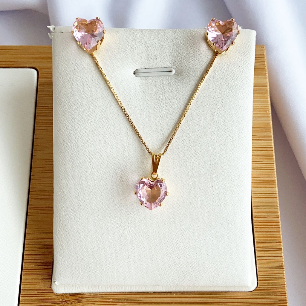 Kit Colar e Brinco Coração Zircônia Rose Banhado A Ouro 18k Antialérgico