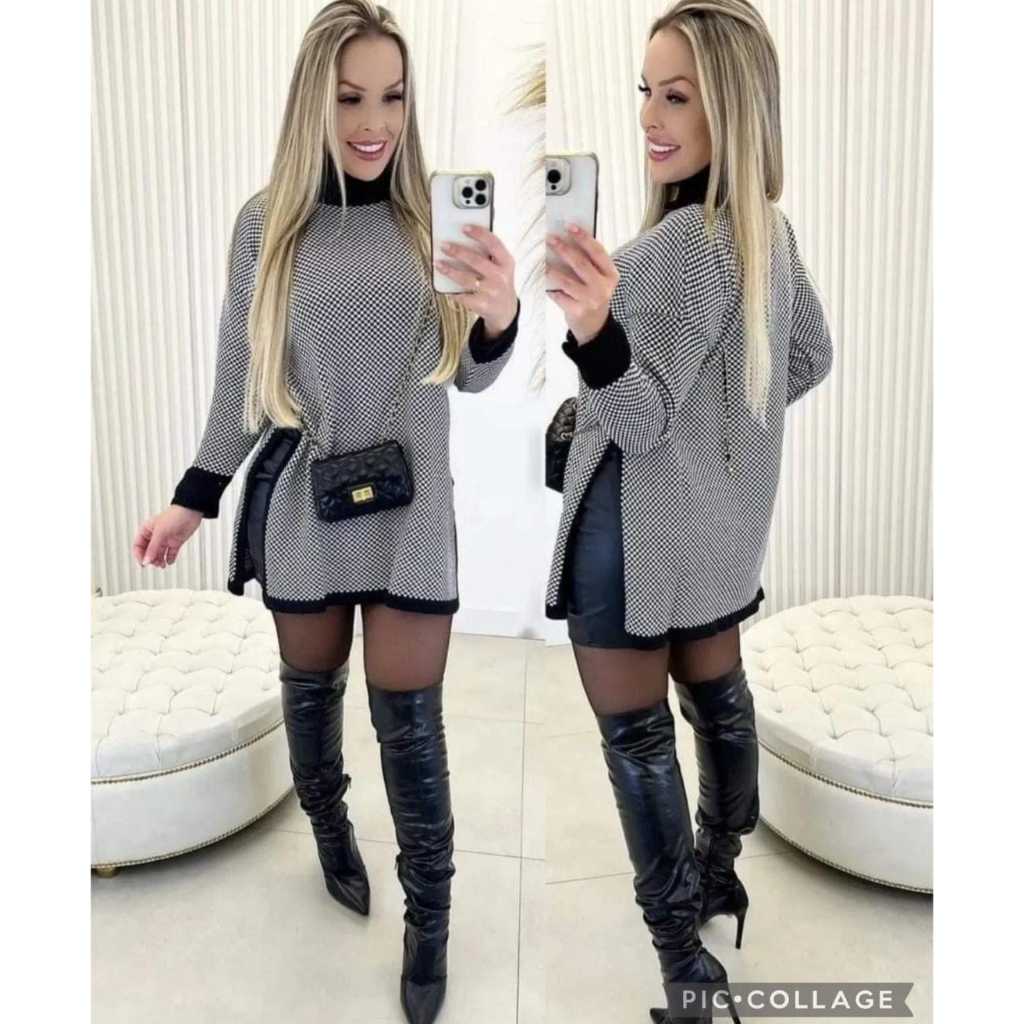 Poncho Feminino Tricô Gola Alta Manga Longa Mousse Estampo Xadrez