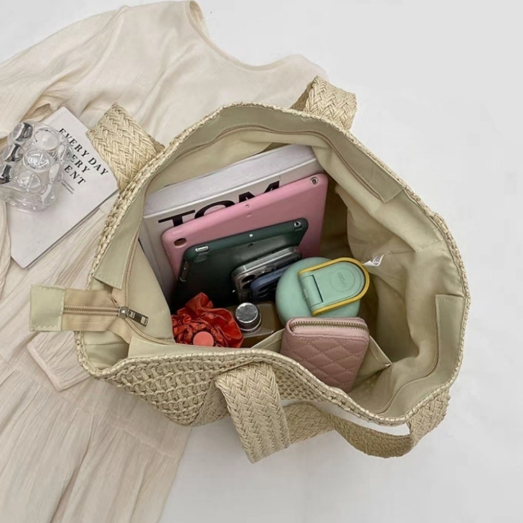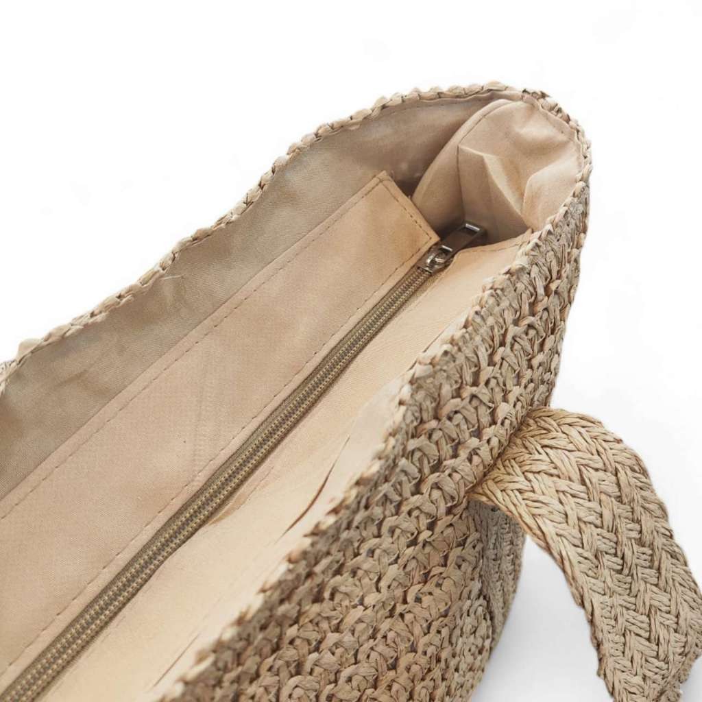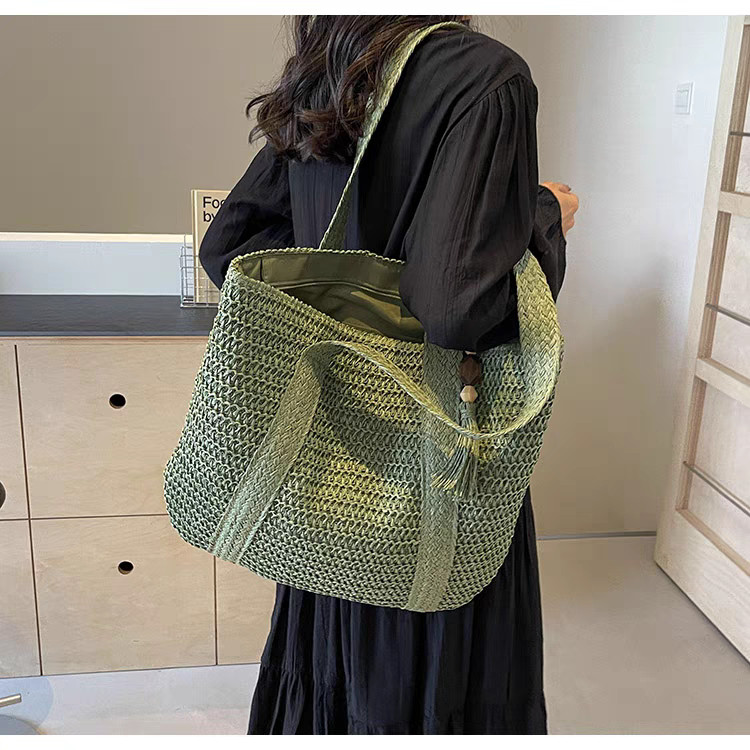 Bolsa De Palha Grande Verão De Ombro Com Chaveiro, Fechamento De Zíper Praia