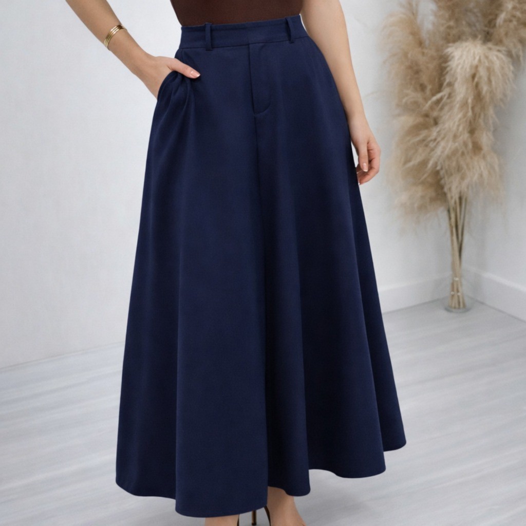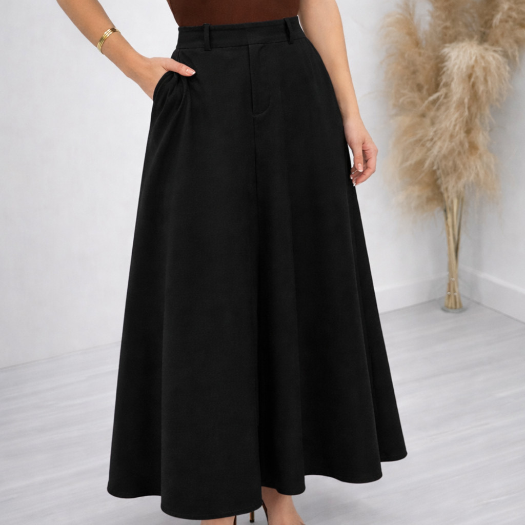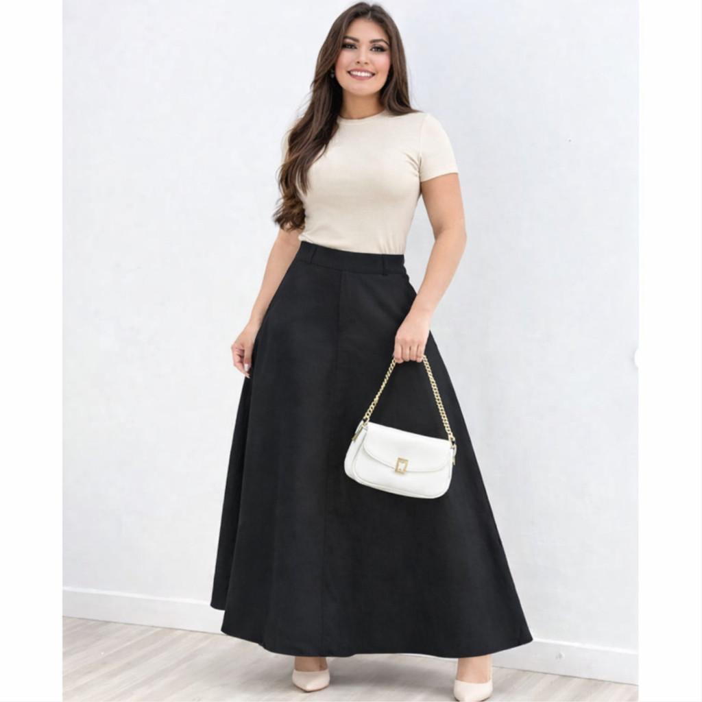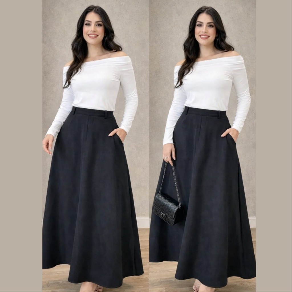 Saia Longa Alfaiataria Feminina Cintura Alta Moda Evangelica Elegante Godê Social Premium Rodada Bolso