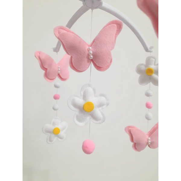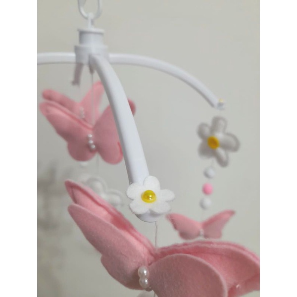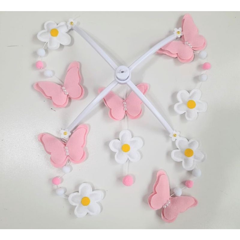 Móbile Músical e Giratório Borboleta Flor Flores Rosa e Branco