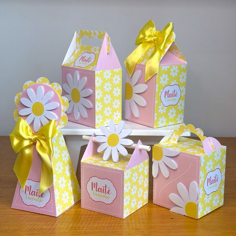 Kit Caixinhas Personalizadas Margaridas – Pegue e Monte (15, 25, 50un) Lembrancinhas Festa Infantil Floral Chá de Bebe