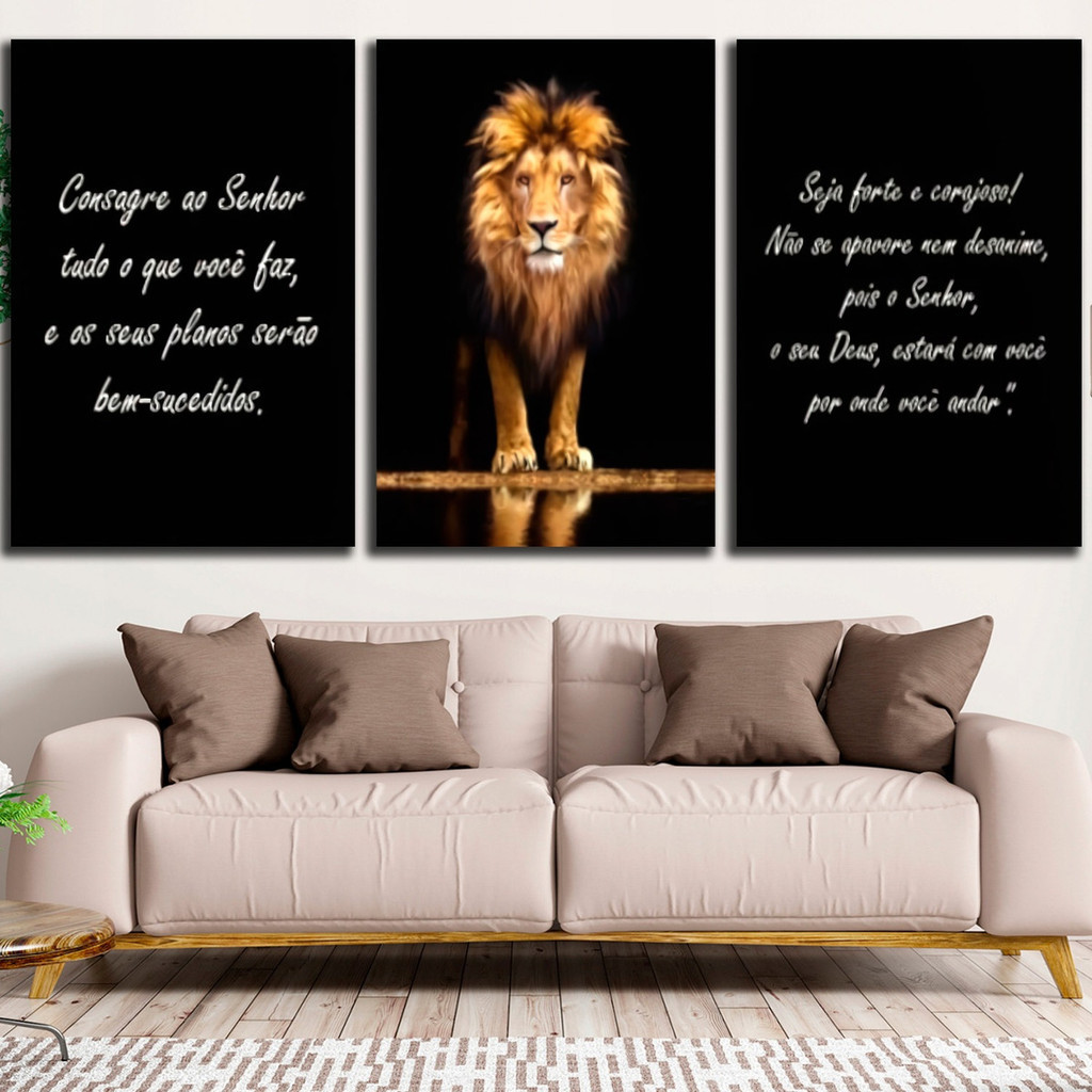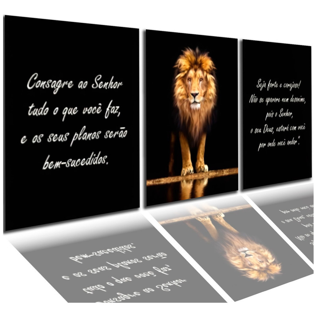 Kit 3 Quadros Decorativos Mosaico Leão Versículos Bíblicos Motivacionais Para Sala Quarto Escritório Hall
