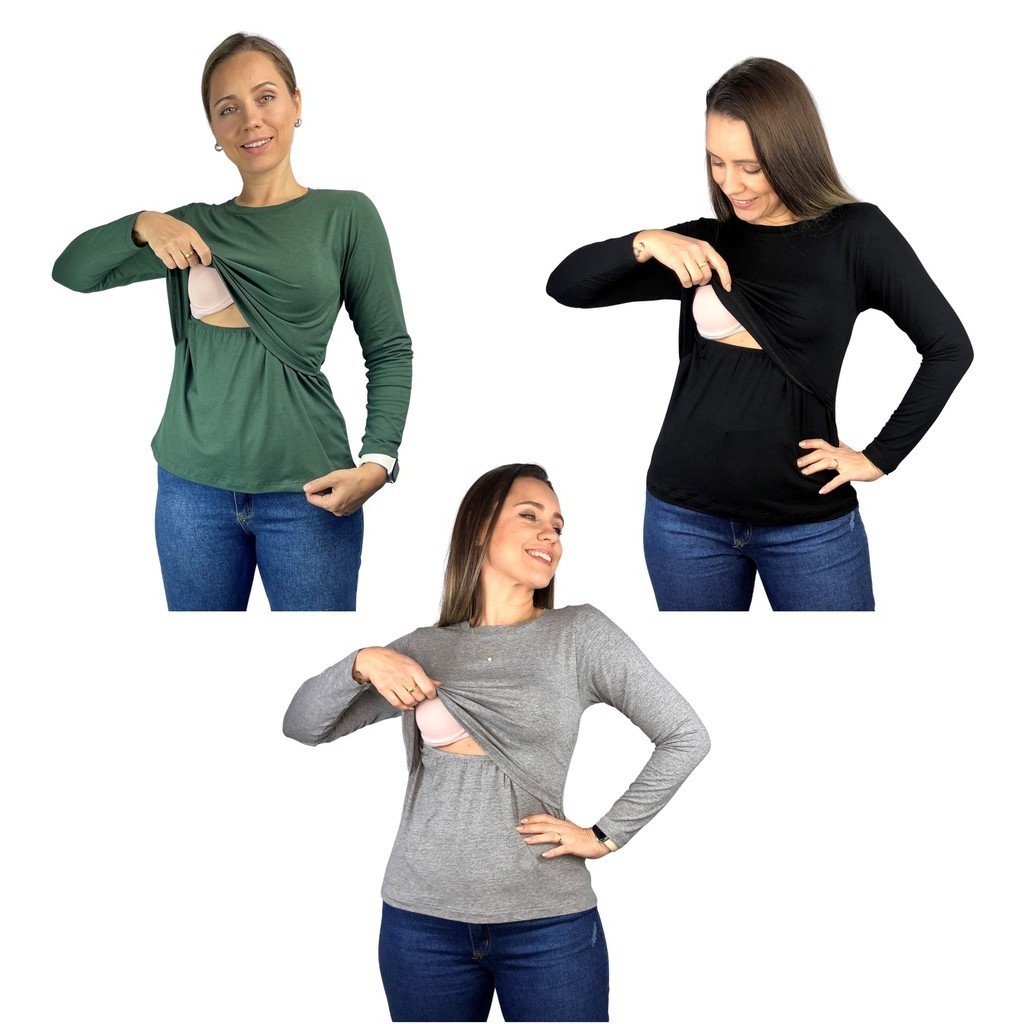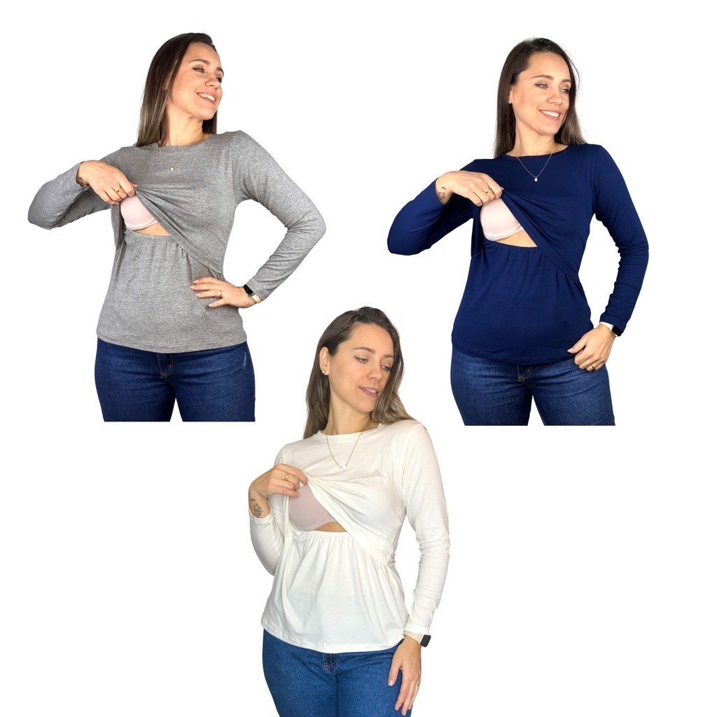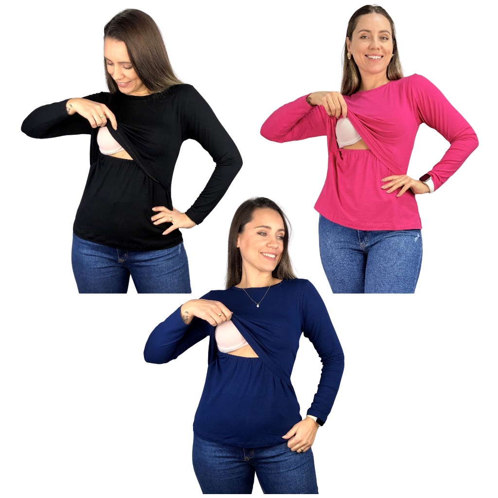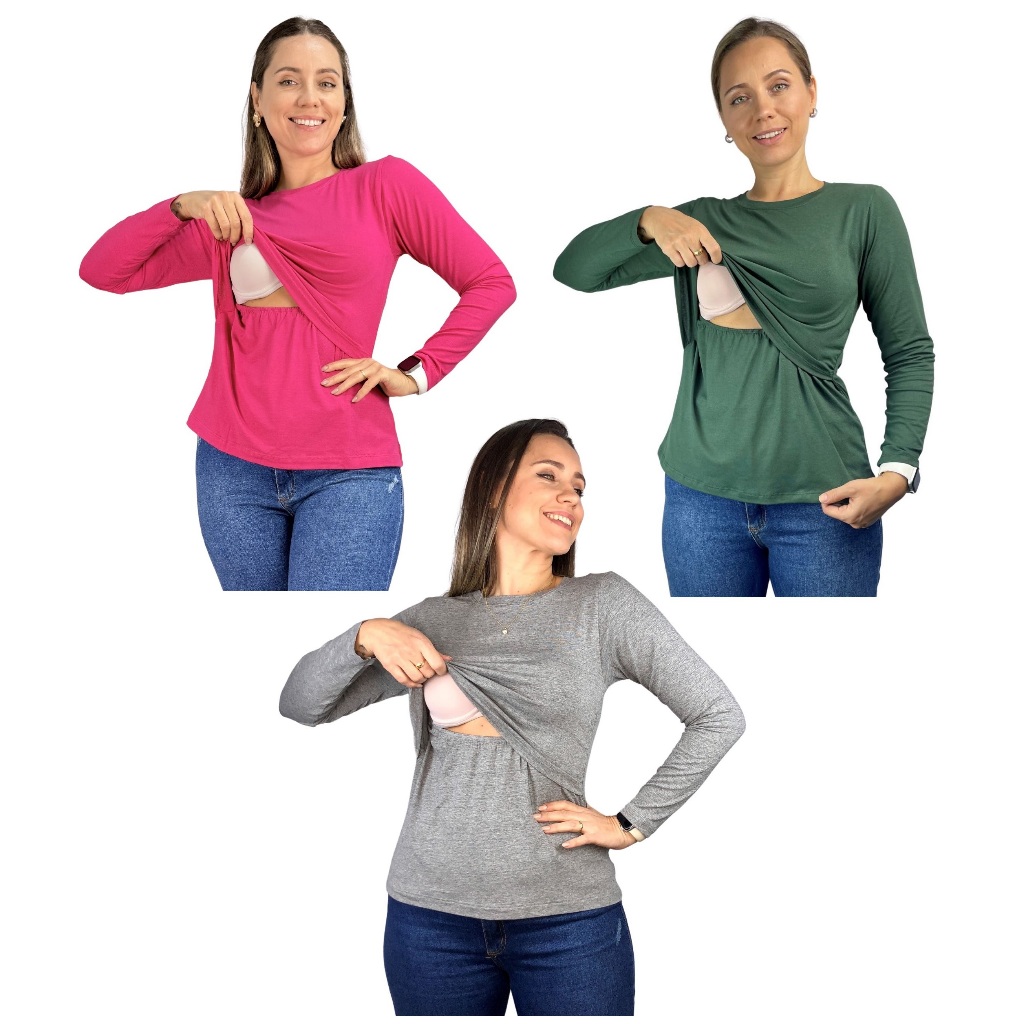 Kit 3 Blusa Amamentação Diversas Cores Premium Camiseta Manga Longa Gestante Grávida Maternidade