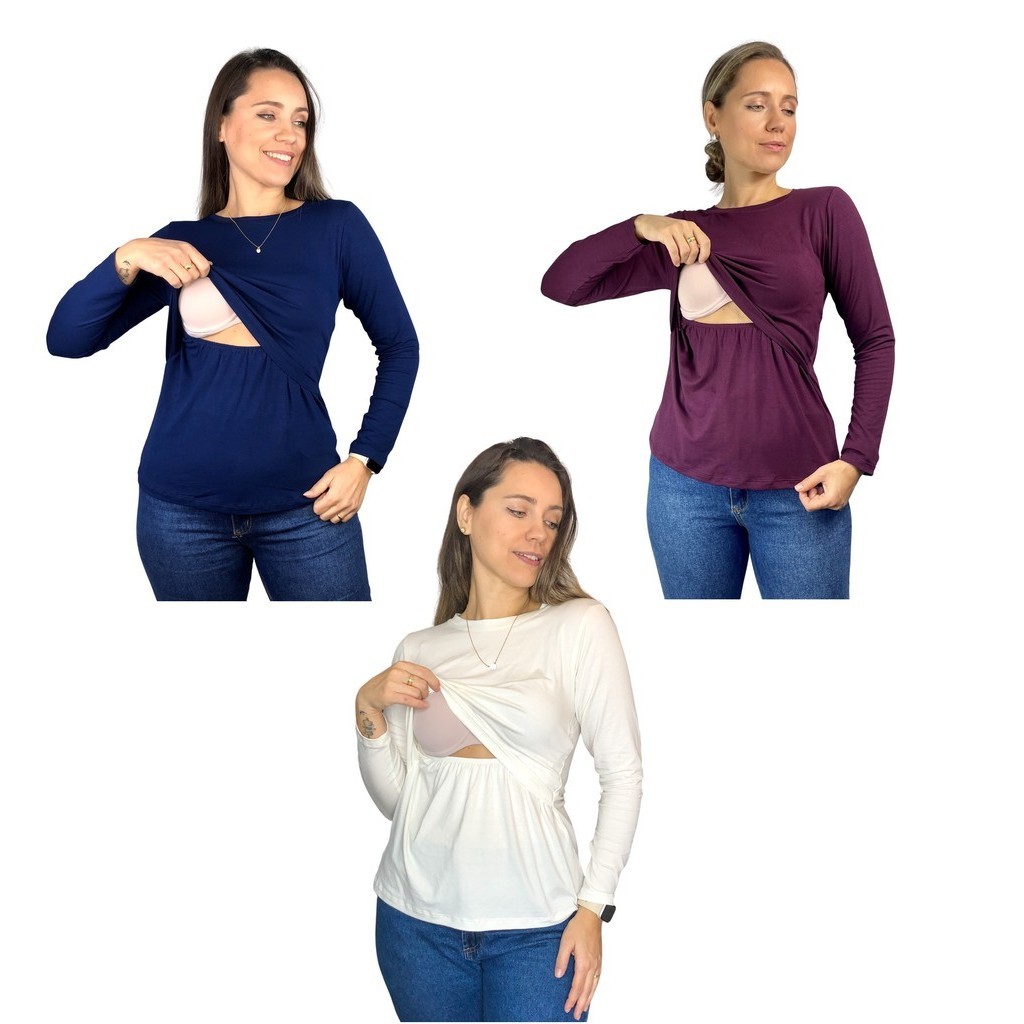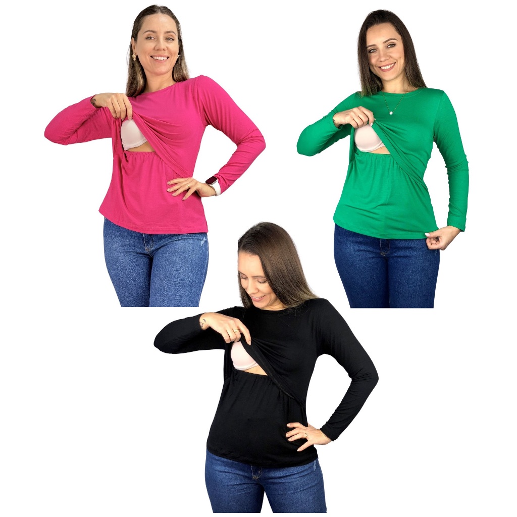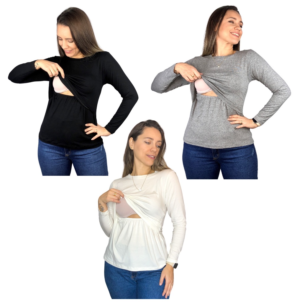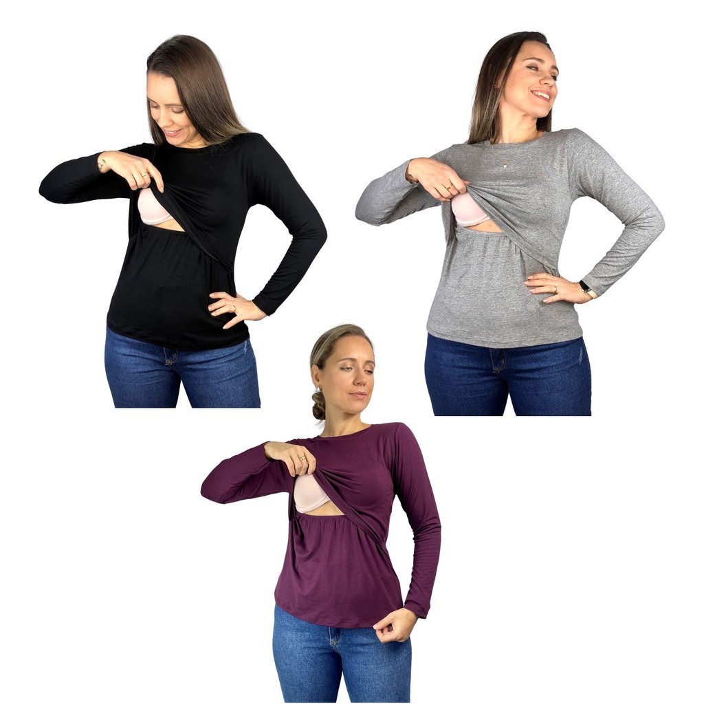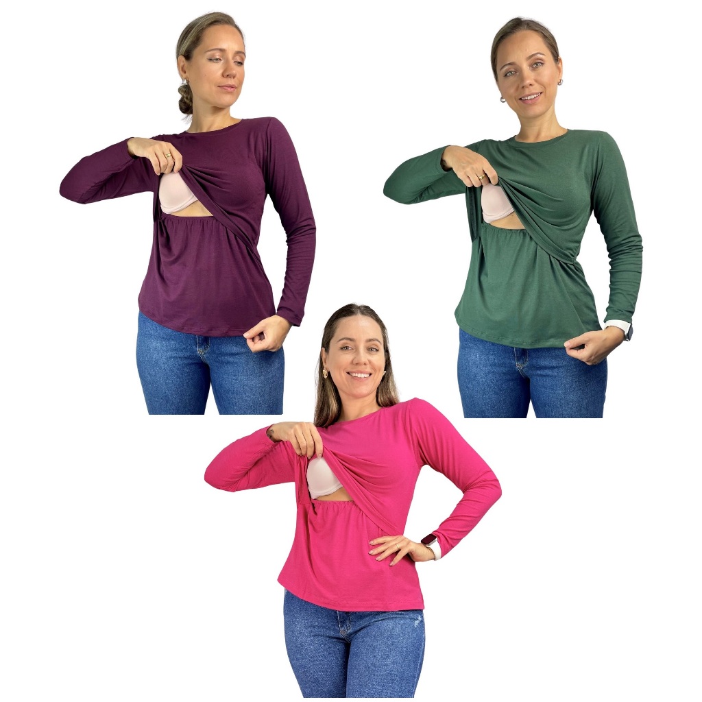 Kit 3 Blusa Amamentação Diversas Cores Premium Camiseta Manga Longa Gestante Grávida Maternidade