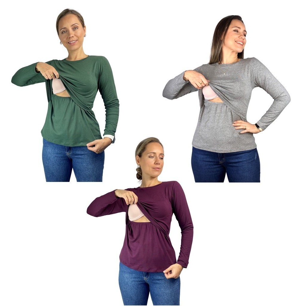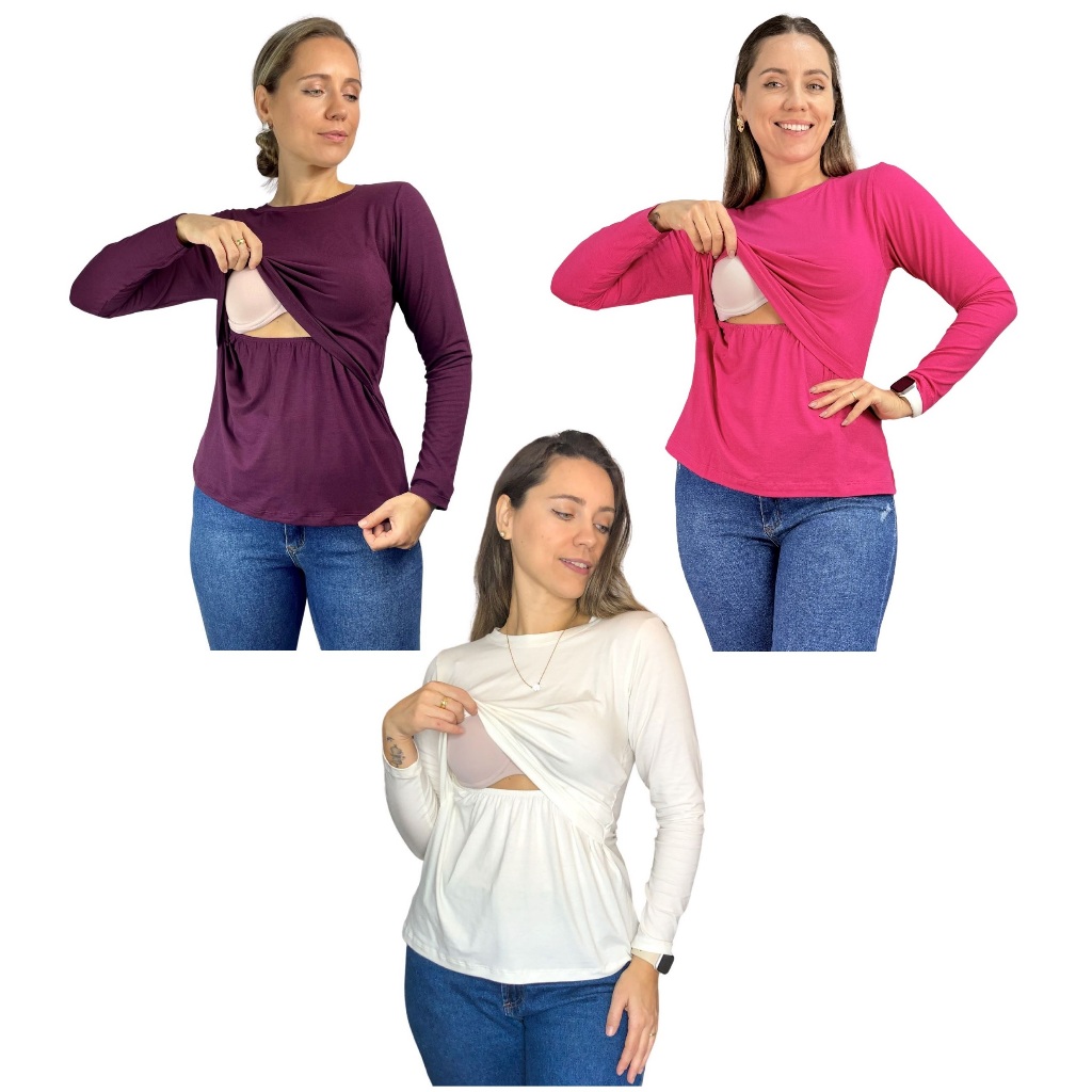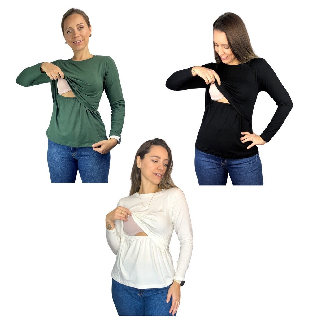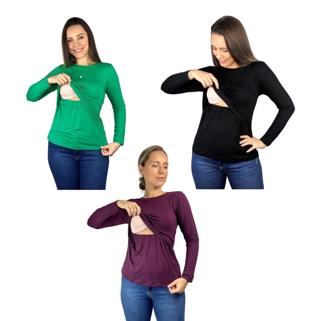 Kit 3 Blusa Amamentação Diversas Cores Premium Camiseta Manga Longa Gestante Grávida Maternidade