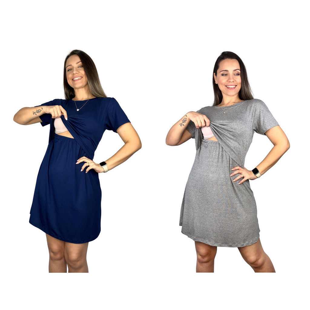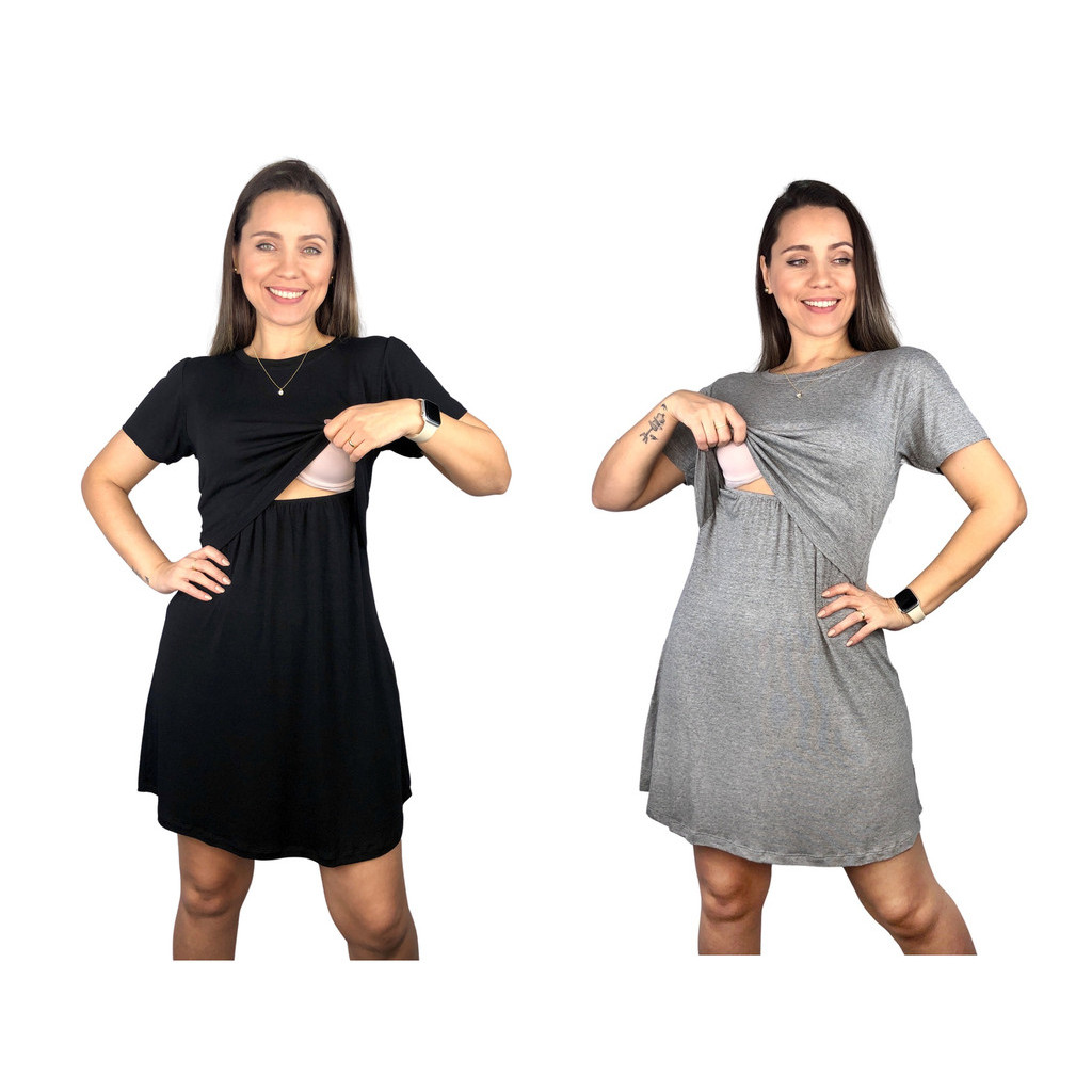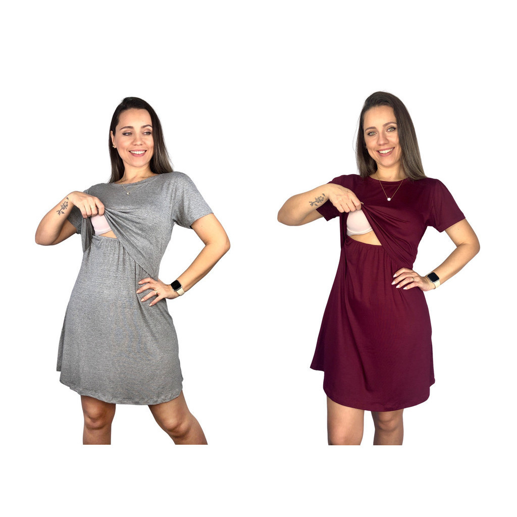 Kit 2 Vestido Amamentação Diversas Cores Premium Manga Curta Gestante Grávida Maternidade Amamentar