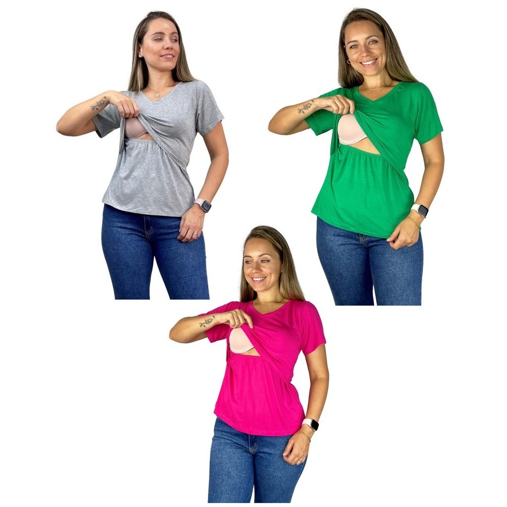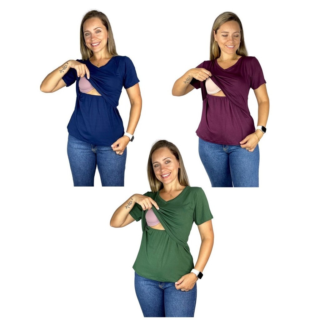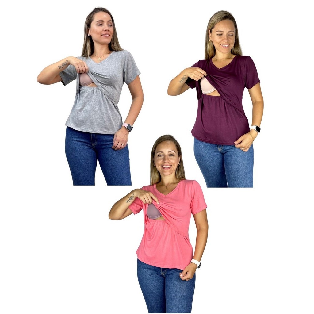 Kit 3 Blusa Amamentação Diversas Cores Viscolycra Premium Manga Curta Gola V Grávida Maternidade