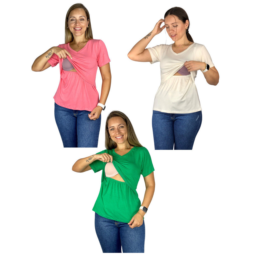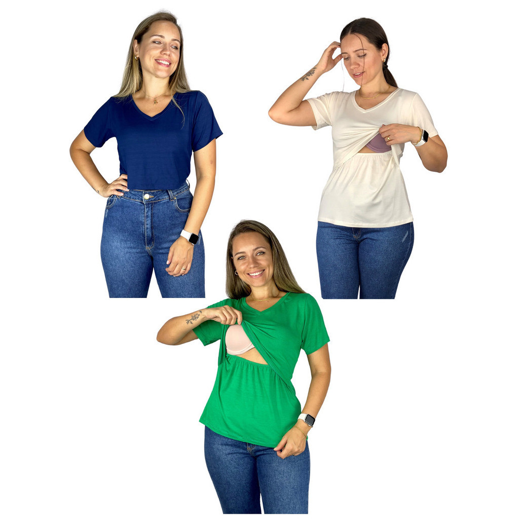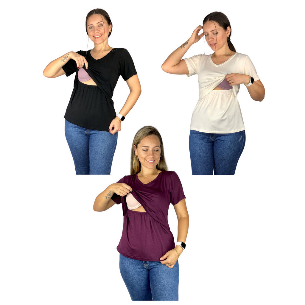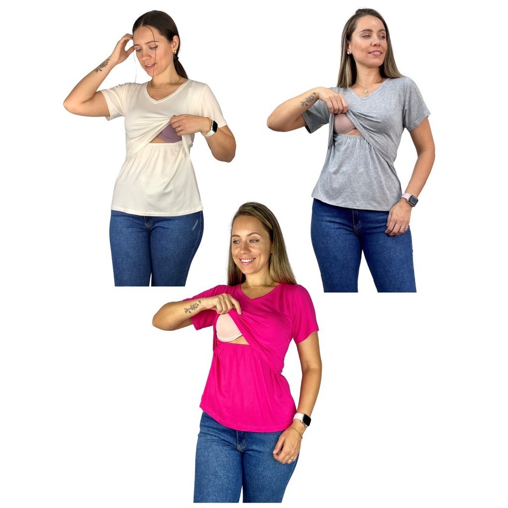 Kit 3 Blusa Amamentação Diversas Cores Viscolycra Premium Manga Curta Gola V Grávida Maternidade