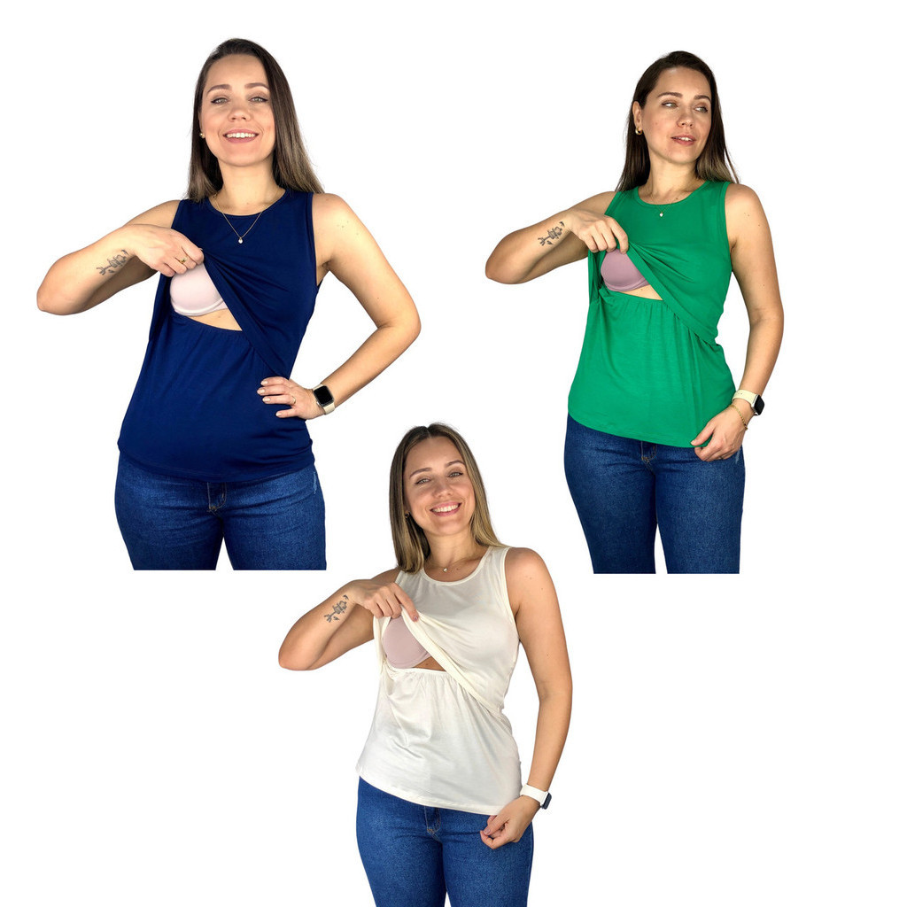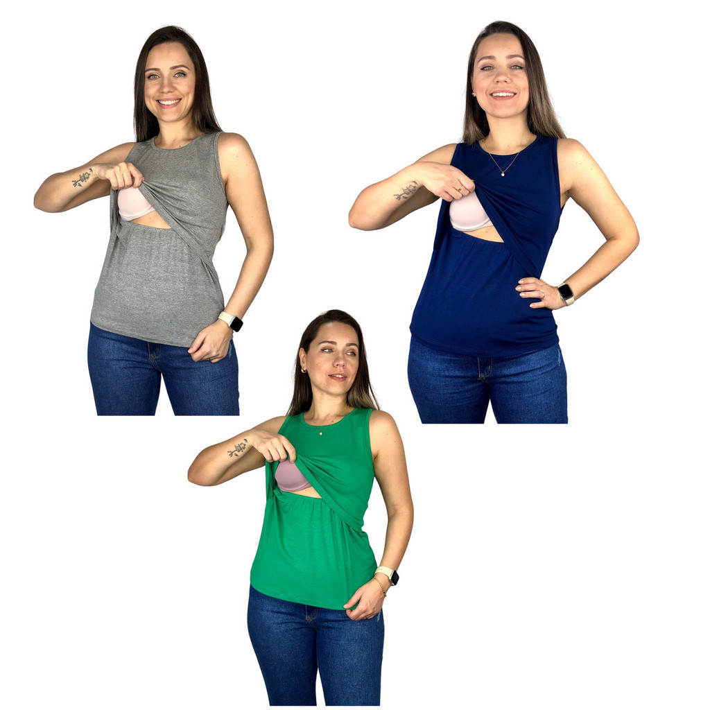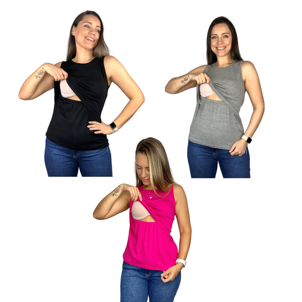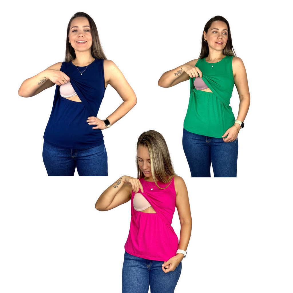 Kit 3 Blusa Amamentação Cores Premium Camiseta Regata T-shirt Gestante Grávida Maternidade Amamentar