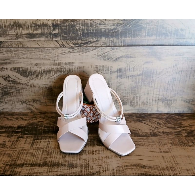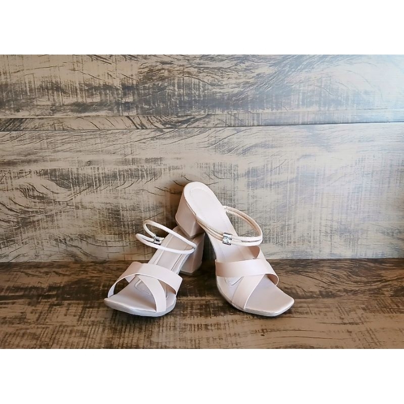 Sandália de salto alto bloco quadrado, rasteira de ajuste amplo tiras largas sintético