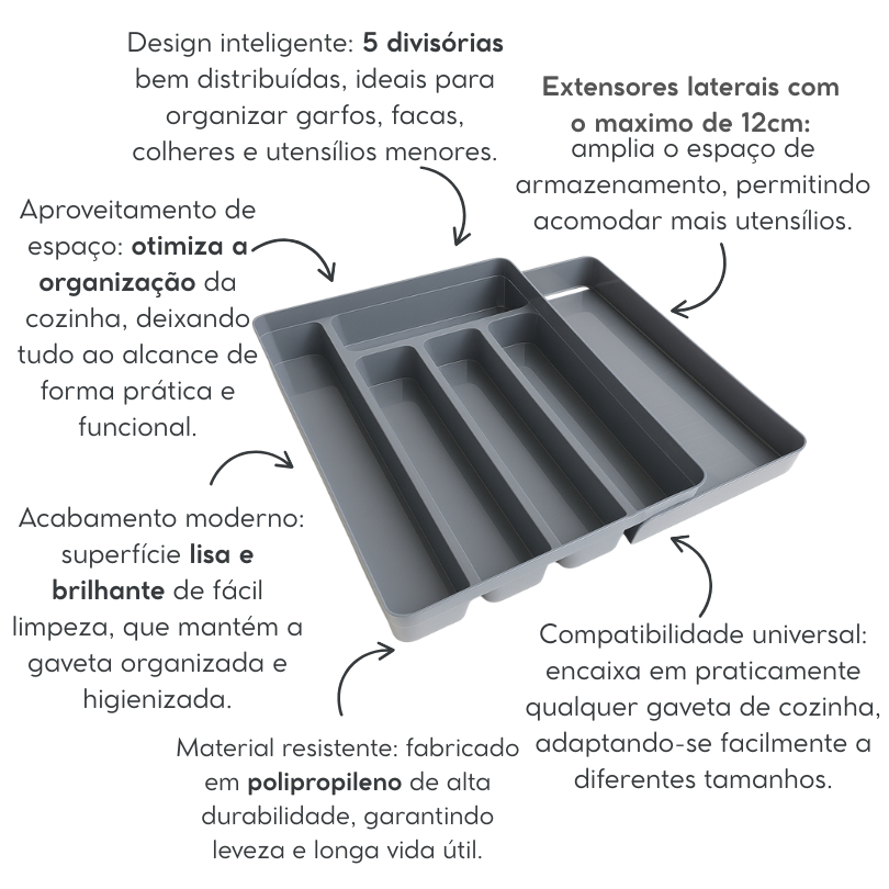 Porta Talher Organizador De Gaveta Com Extensor 5 Divisorias 36x52cm Resistente