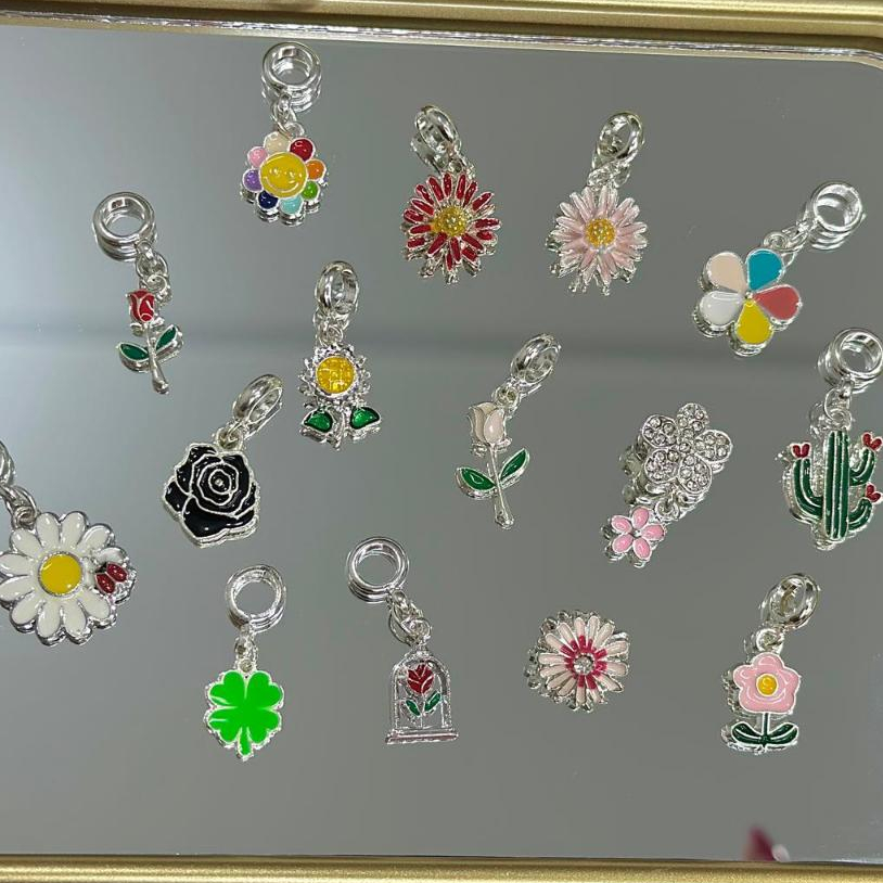 Berloque Flor de brilhos, Rosa encantada, rosa, girassol, margarida, cacto, trevo de quatro folhas, flor colorida