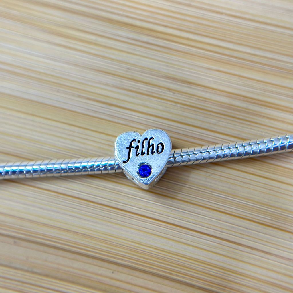 Berloque separador “filho” com pedra azul, banhado a prata, com garantia