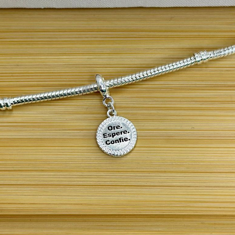 Berloque frase “Ore, Espere, Confie” - Banhado a prata, com garantia
