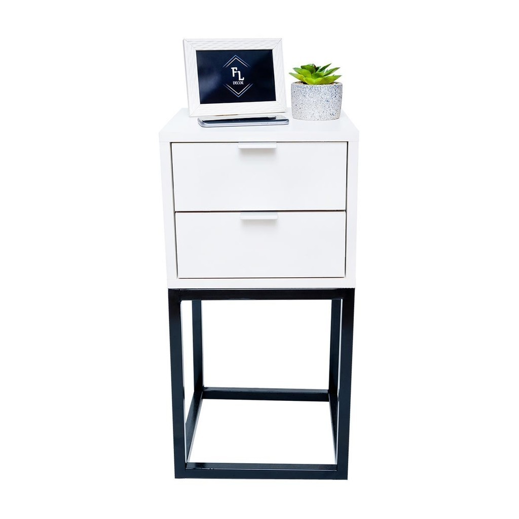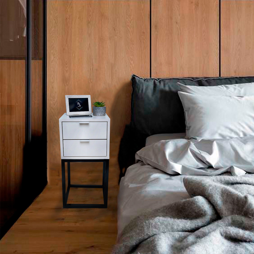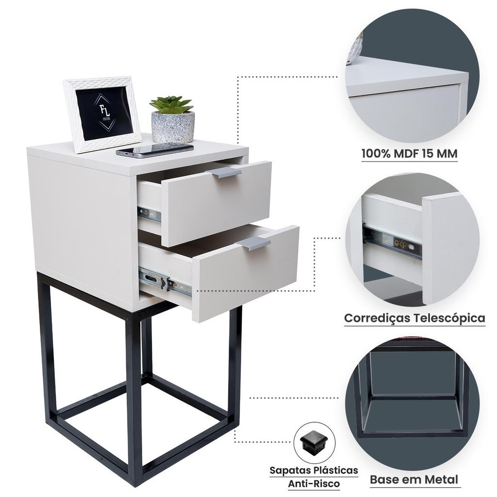 Mesa de Cabeceira Estilo Industrial 30cm Branco 2 Gavetas Pés Ferro Preto Quarto Lateral Cama