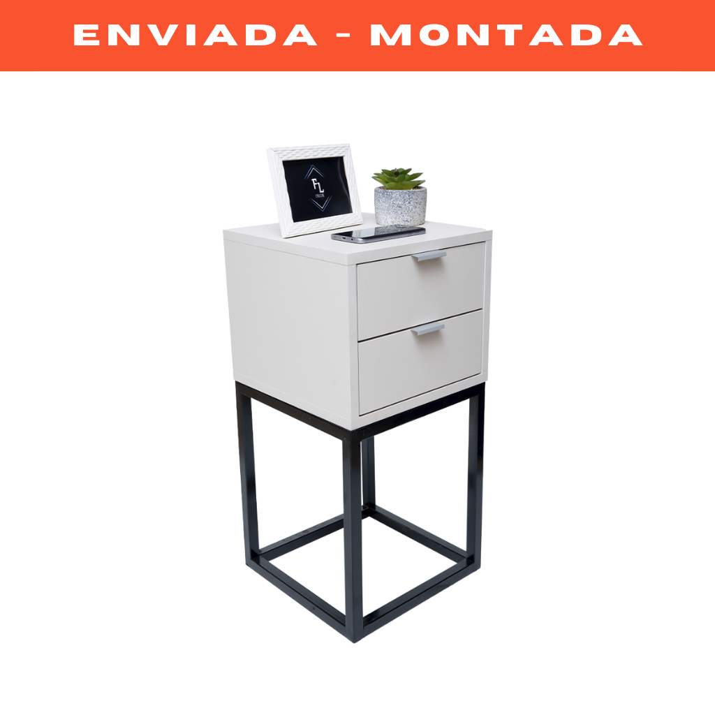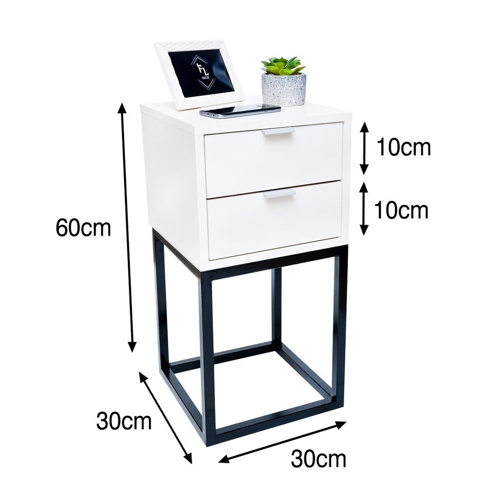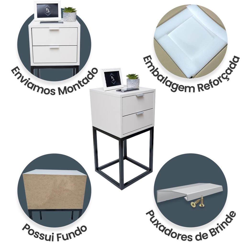 Mesa de Cabeceira Estilo Industrial 30cm Branco 2 Gavetas Pés Ferro Preto Quarto Lateral Cama