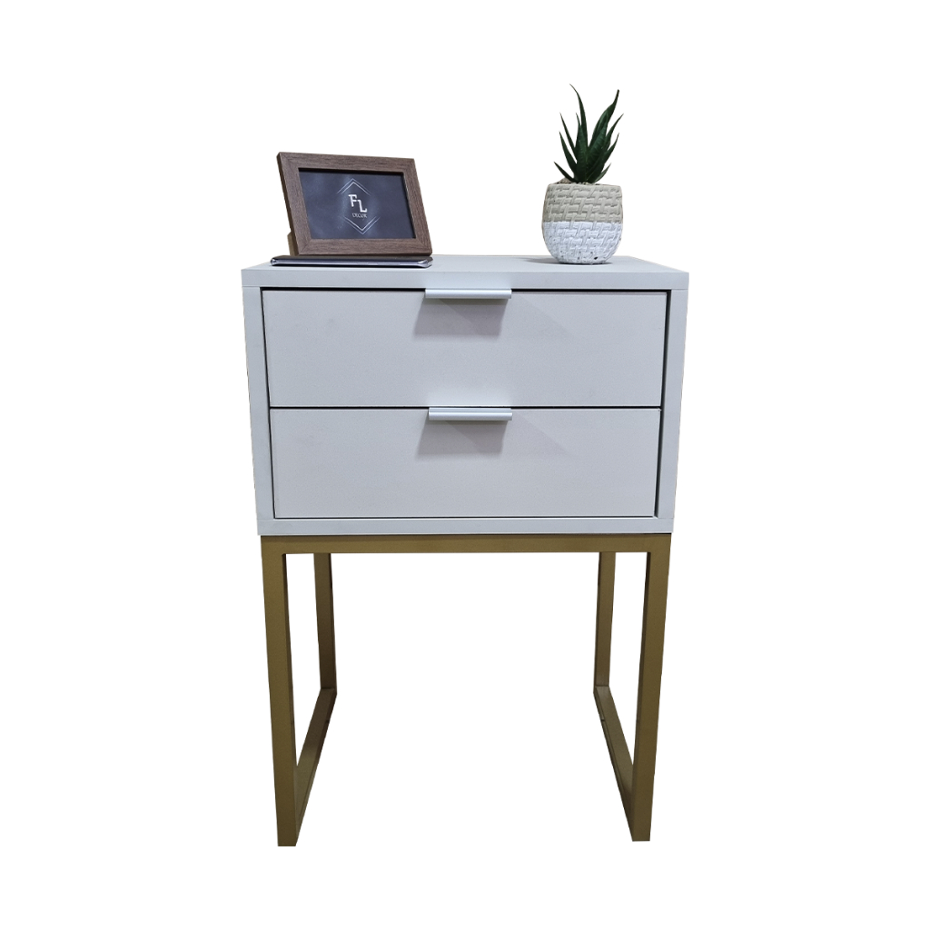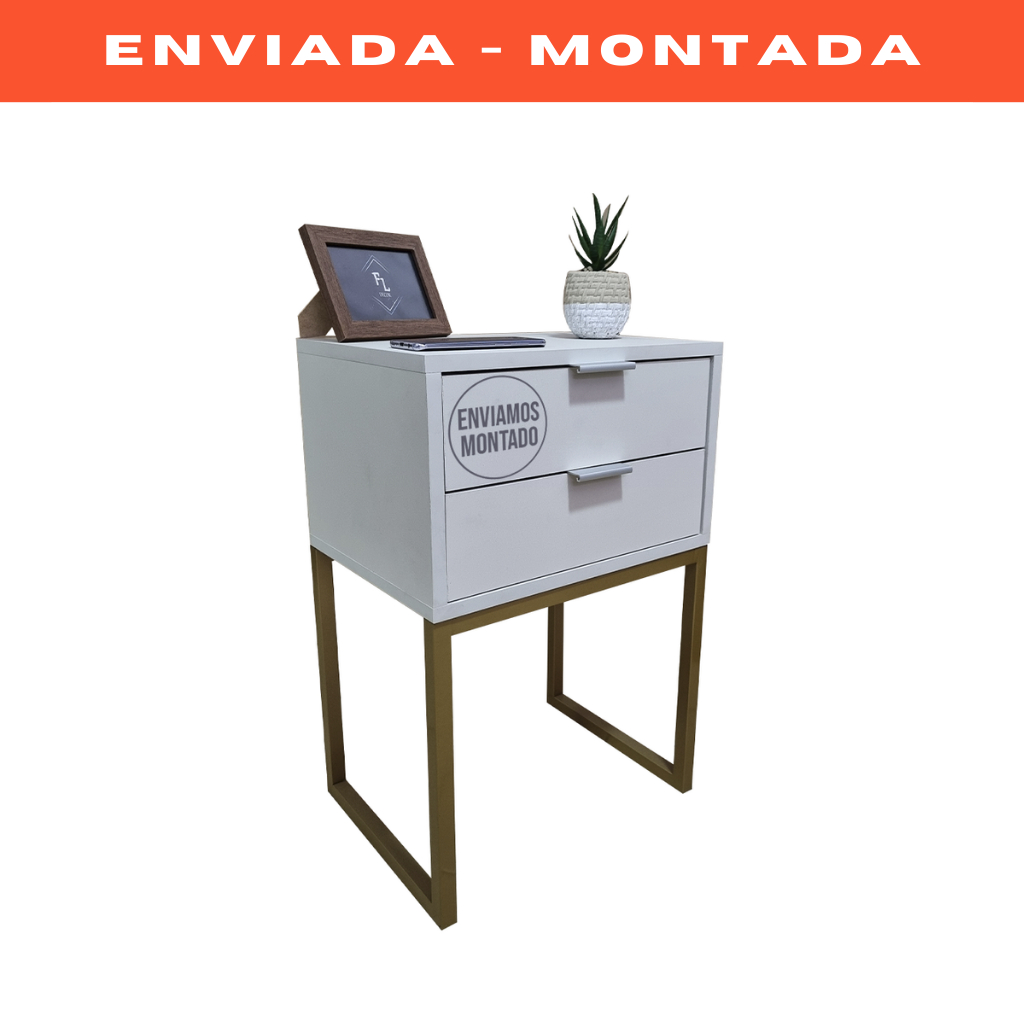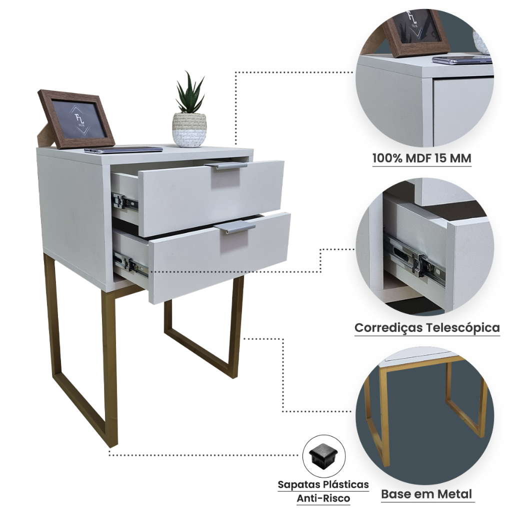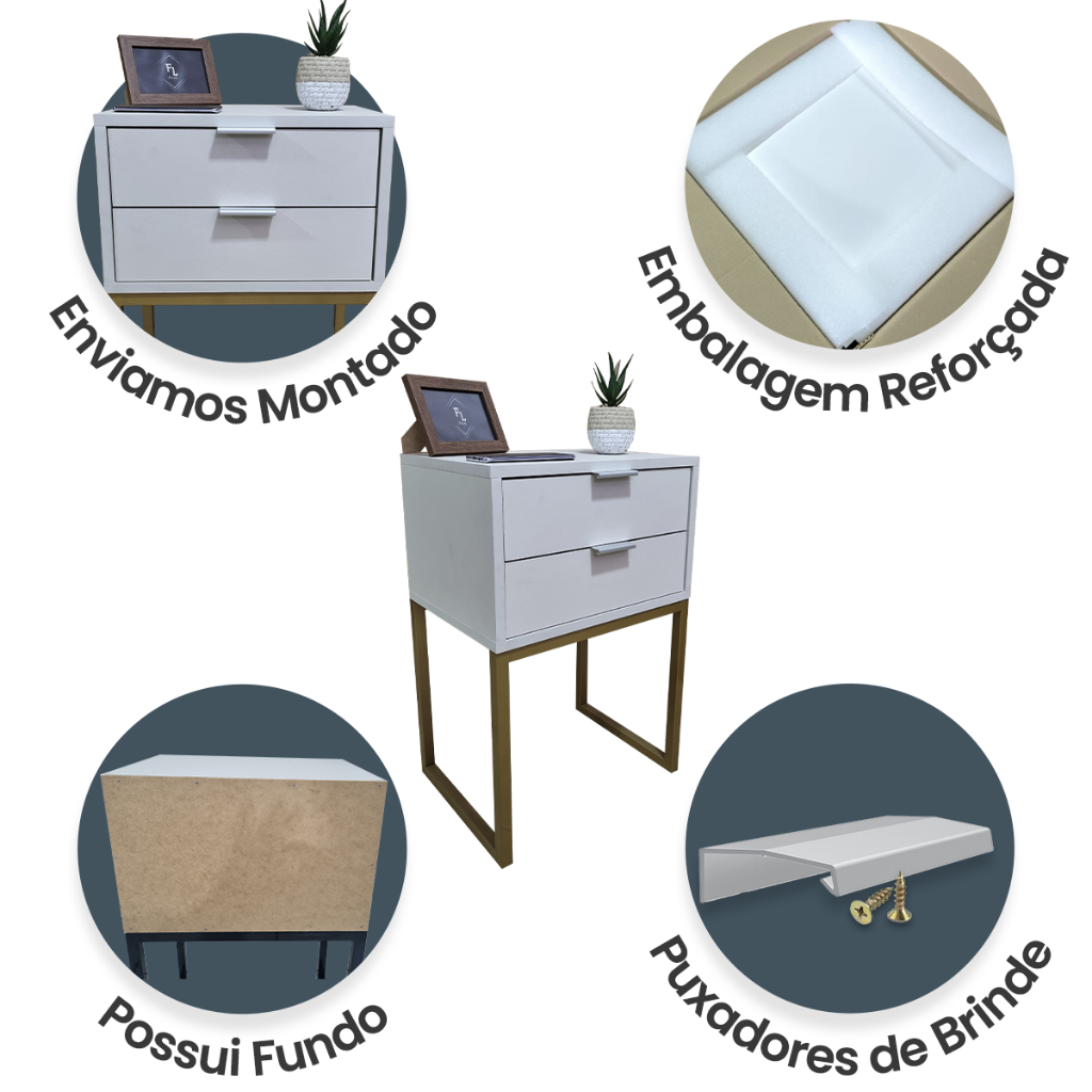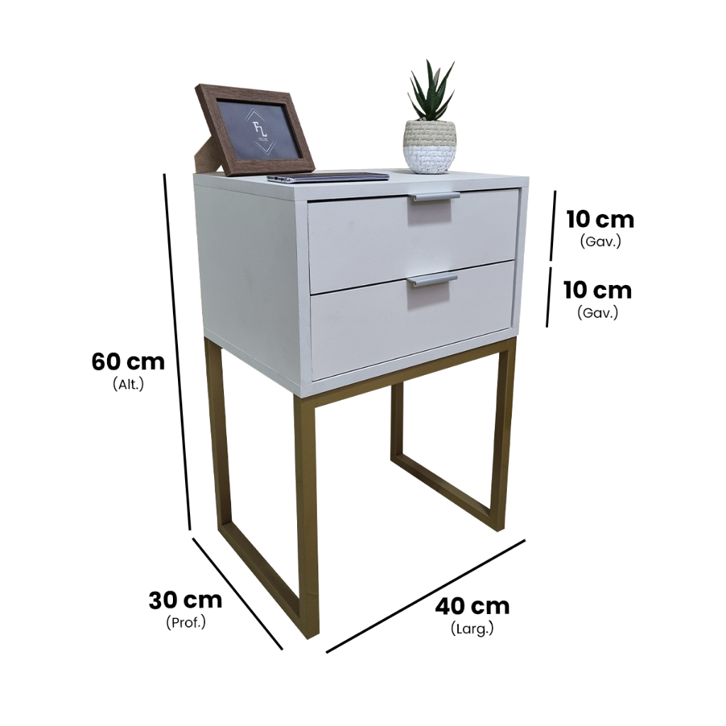 Mesa De Cabeceira Industrial Off White Eco 40cm Com 2 Gavetas Base Dourada Enviamos Montado