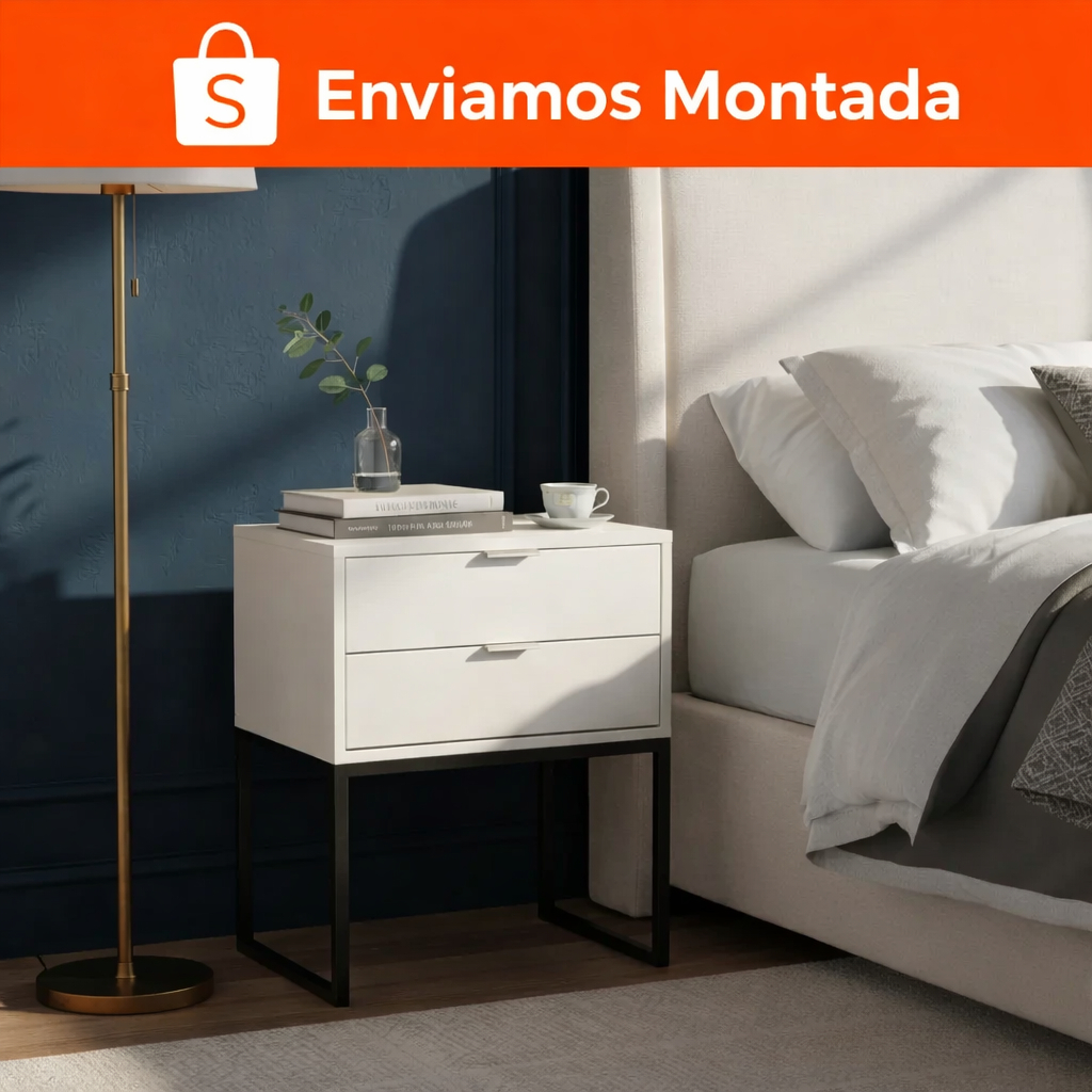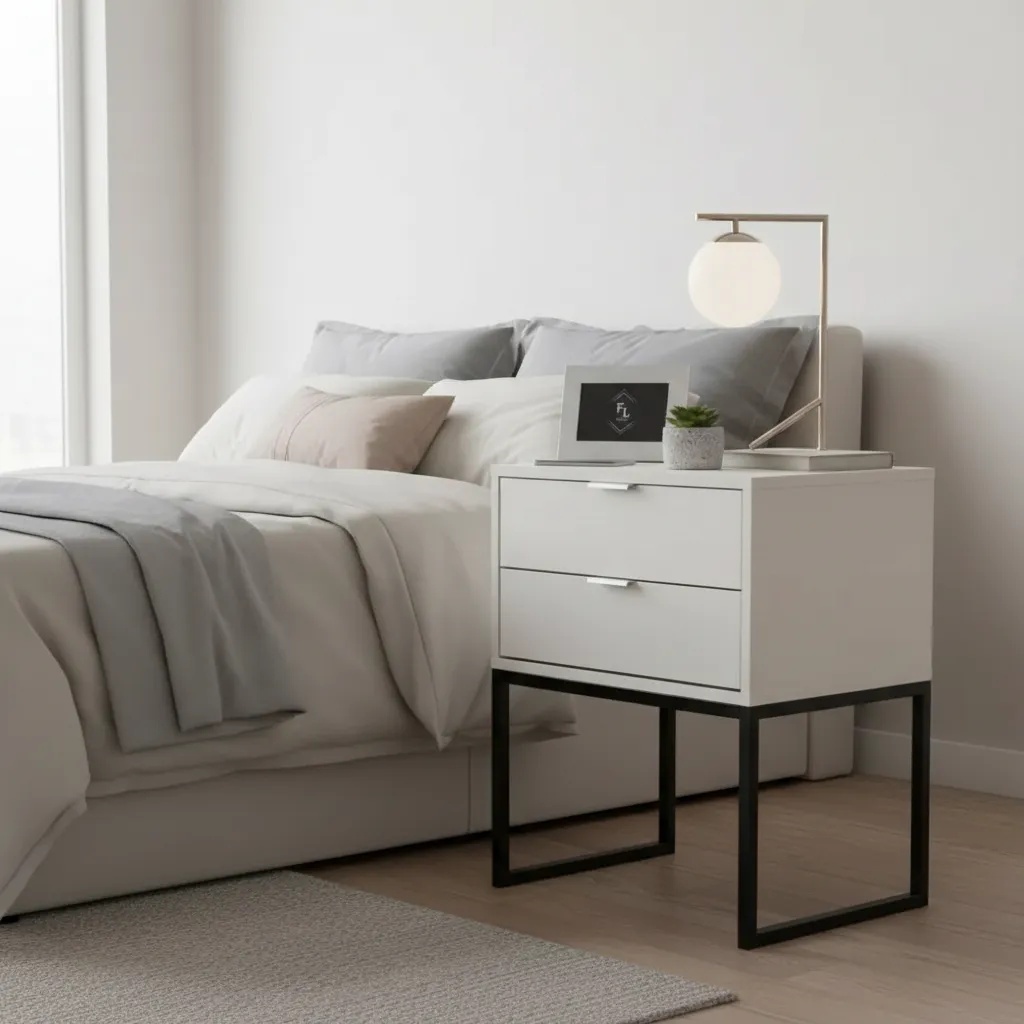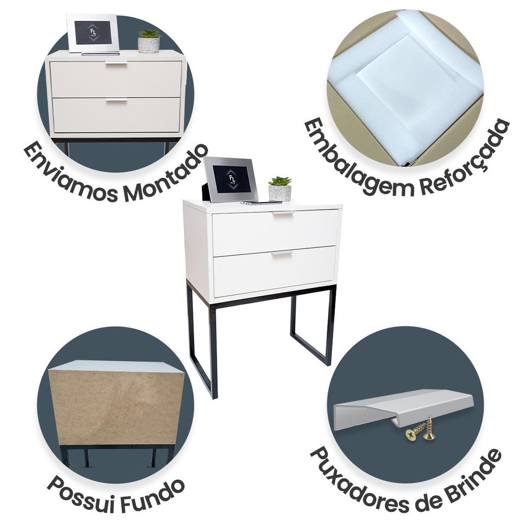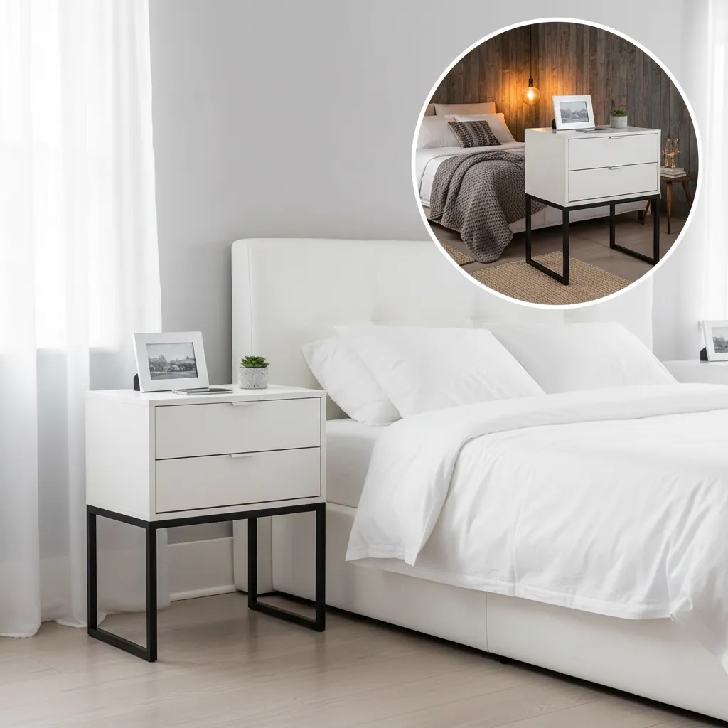 Mesa de Cabeceira Estilo Industrial 40cm Branco 2 Gavetas Pés Ferro Preto Eco Quarto Lateral Cama