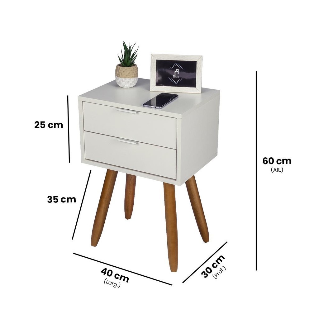 Mesa de Cabeceira Retrô 40cm Branco 2 Gavetas Com Pés Palito Madeira Maciça Quarto Lateral Cama