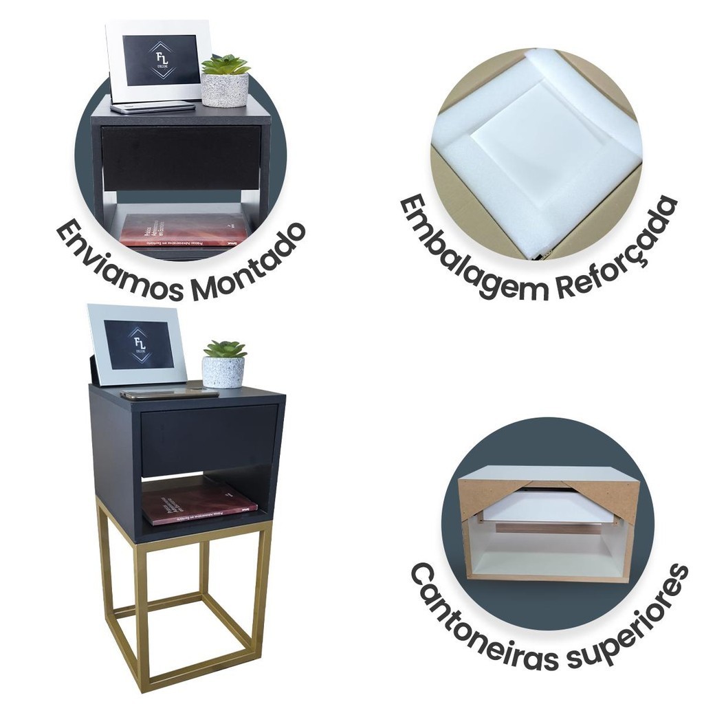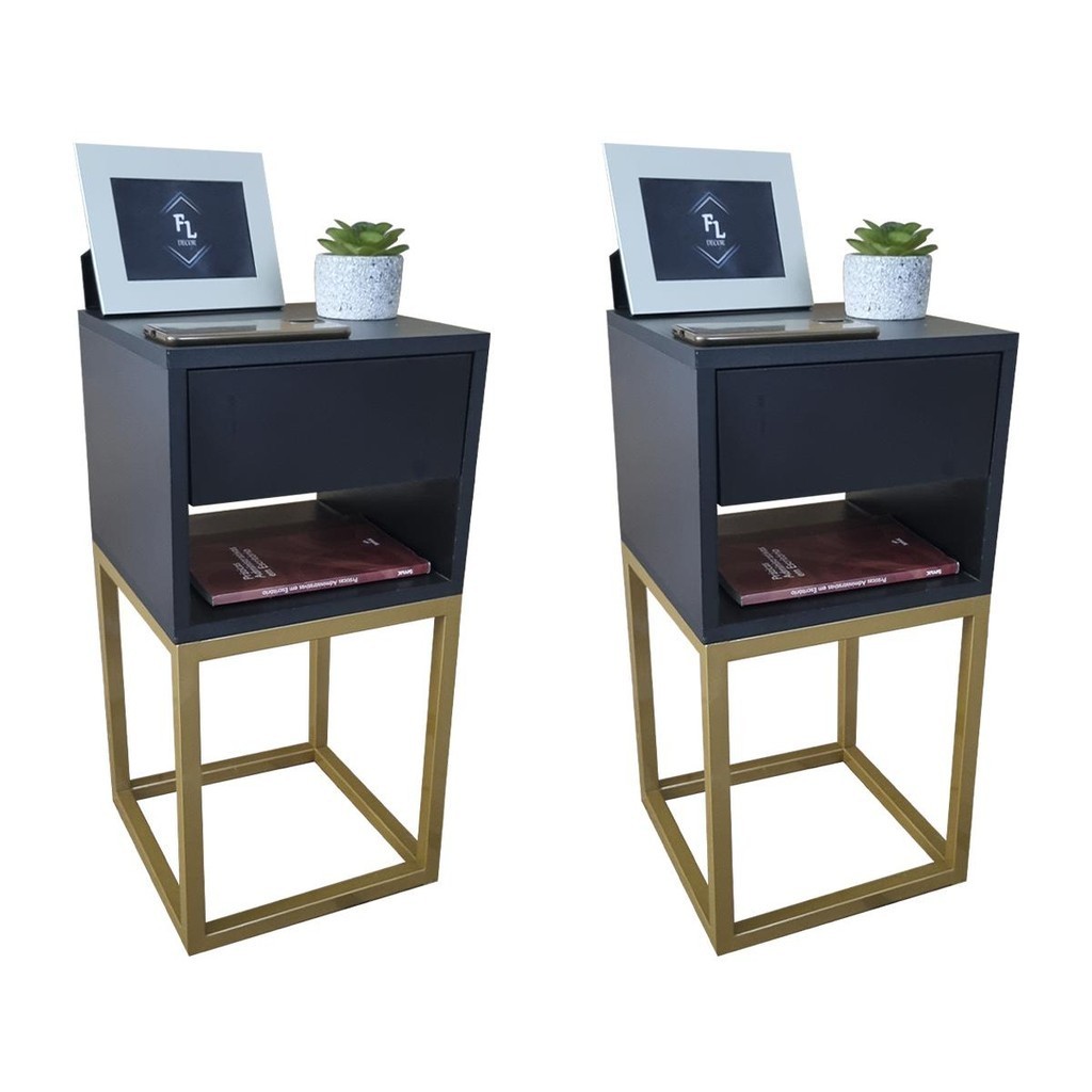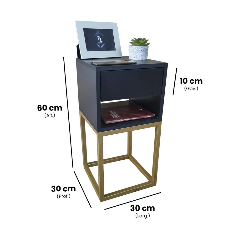 Mesa de Cabeceira Estilo Industrial 30cm Preto Gaveta e Nicho Pés Ferro Dourada Quarto Lateral Cama