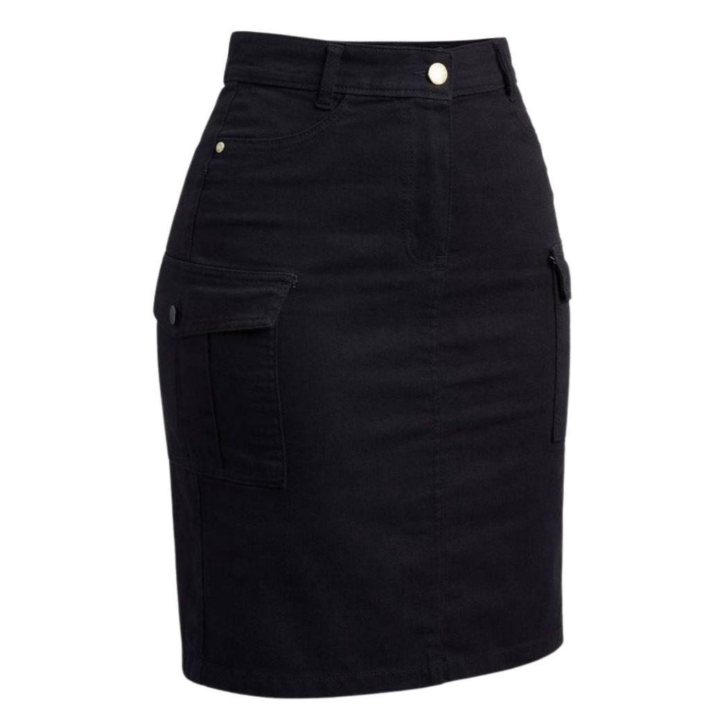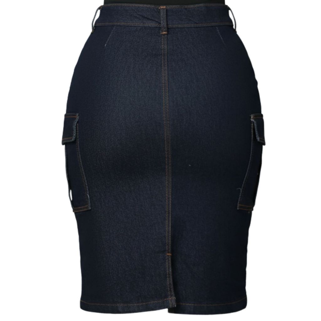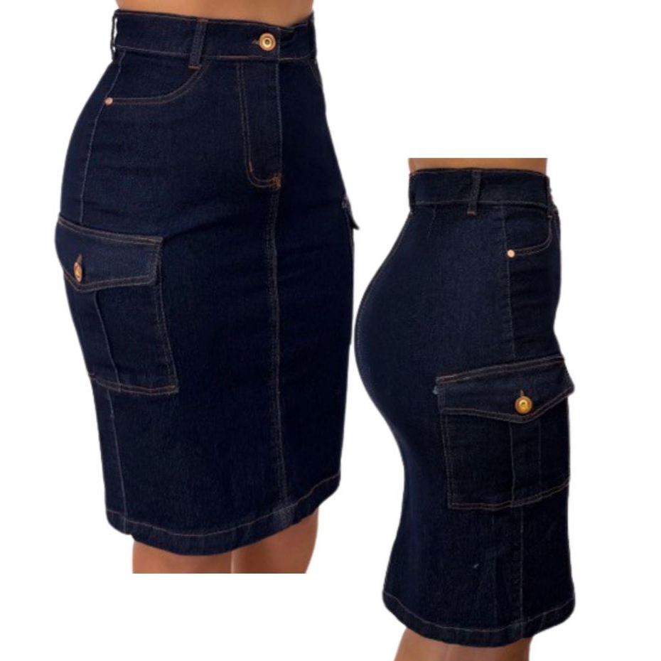 Saia Cargo Jeans Feminina Mídi Cintura Alta Bolso Cargo Lateral Jeans Com Elastano