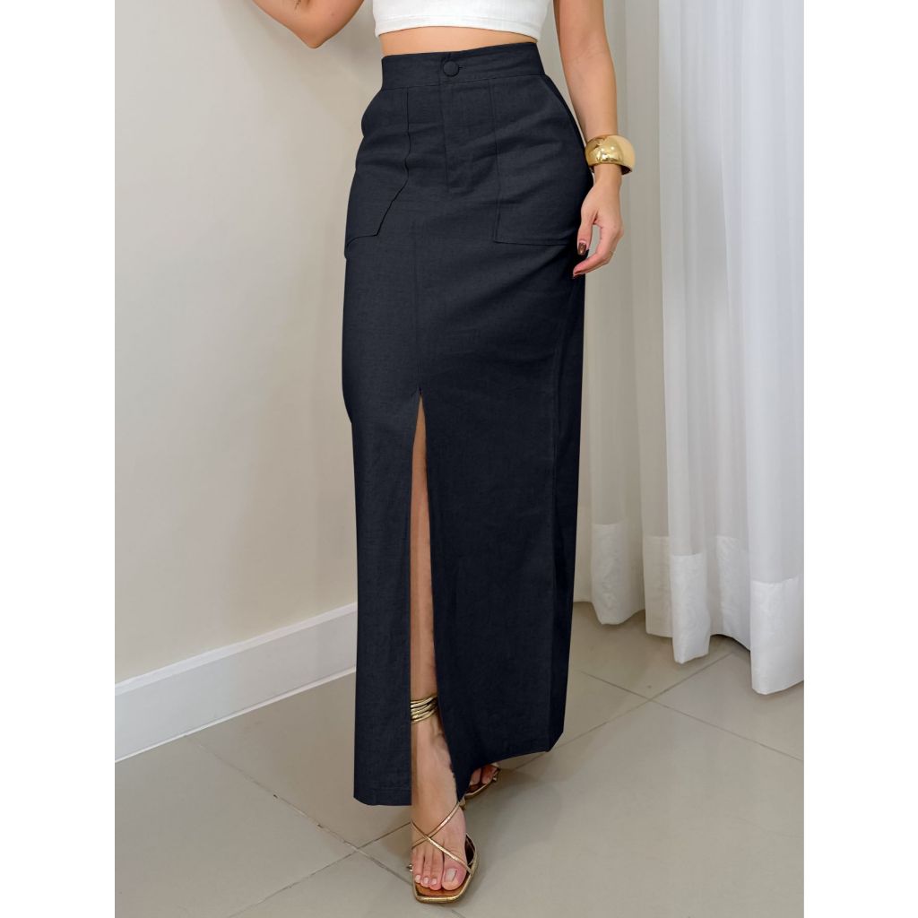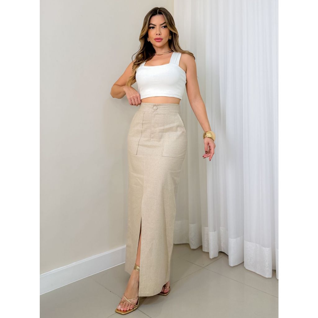EMILI Saia Longa em Linho Feminino Elegante / Cos Alto / Dois Botoes / Gode - S843