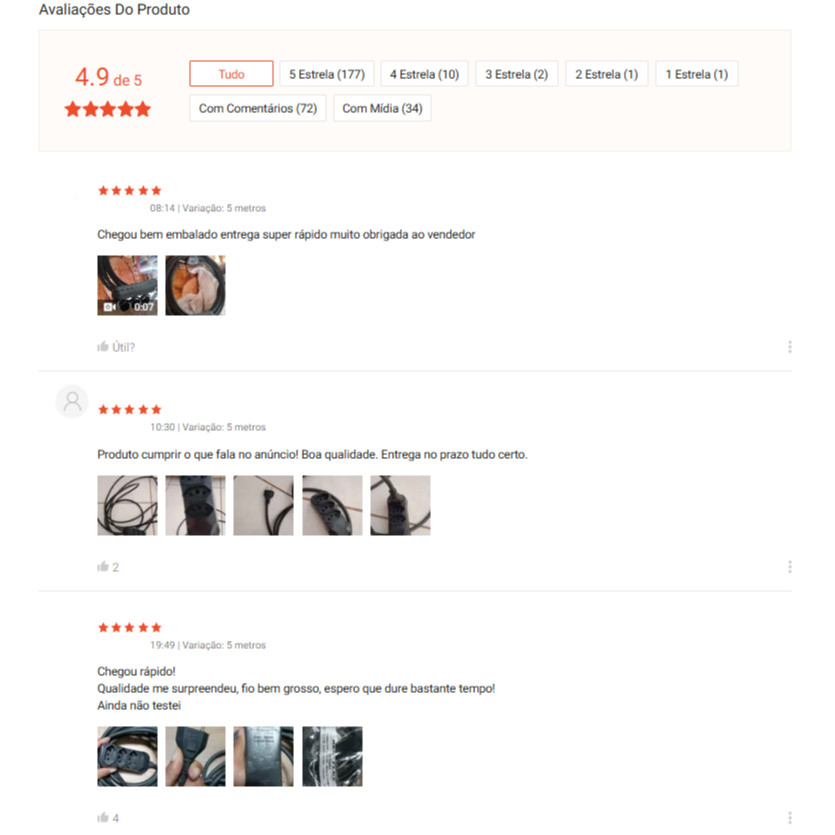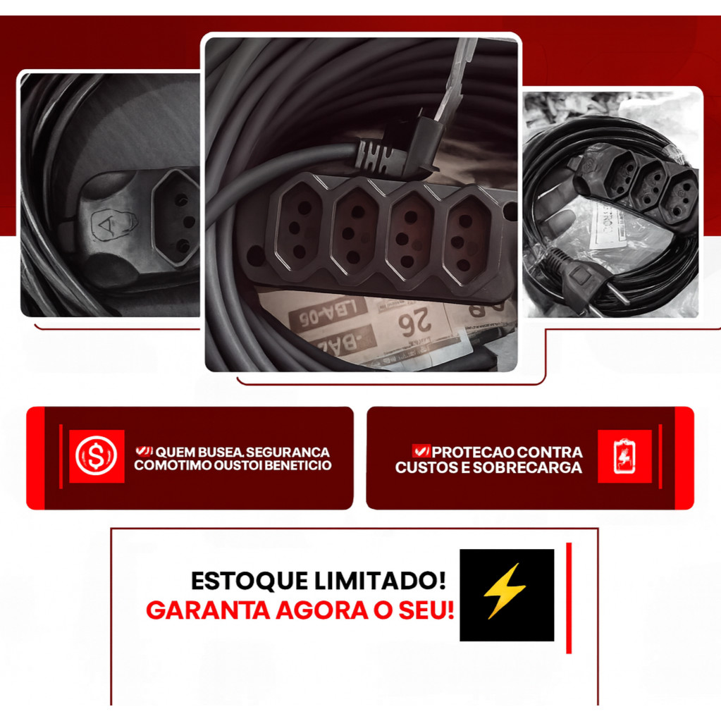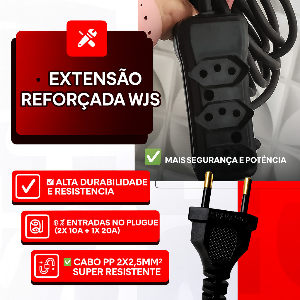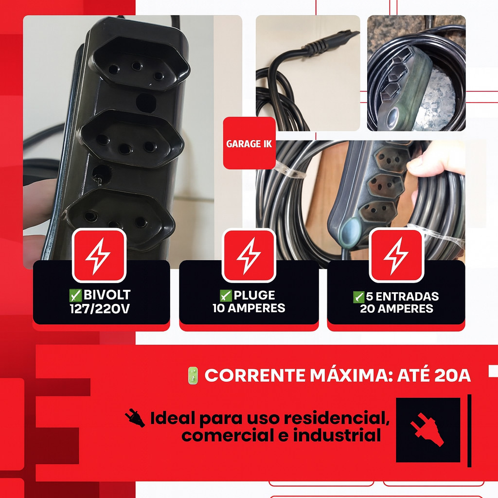Extensão Elétrica Cabo PP 2/5/10/15/20/25 Metros Reforçada 2x2.5mm 10/20A Cor Preto Bivolt 127/220V