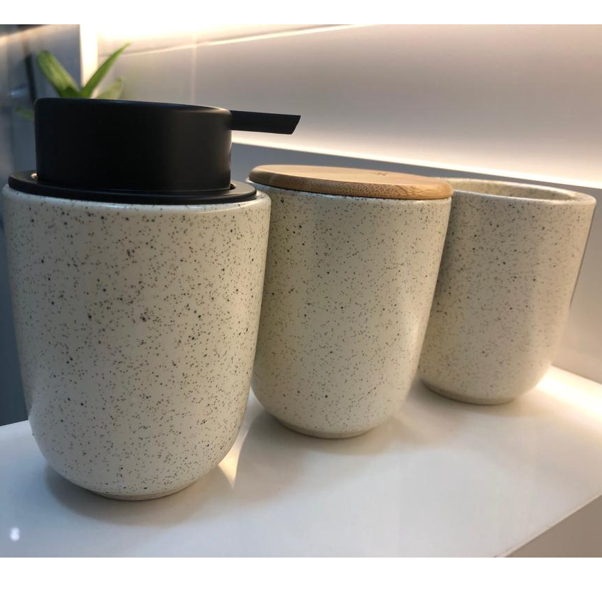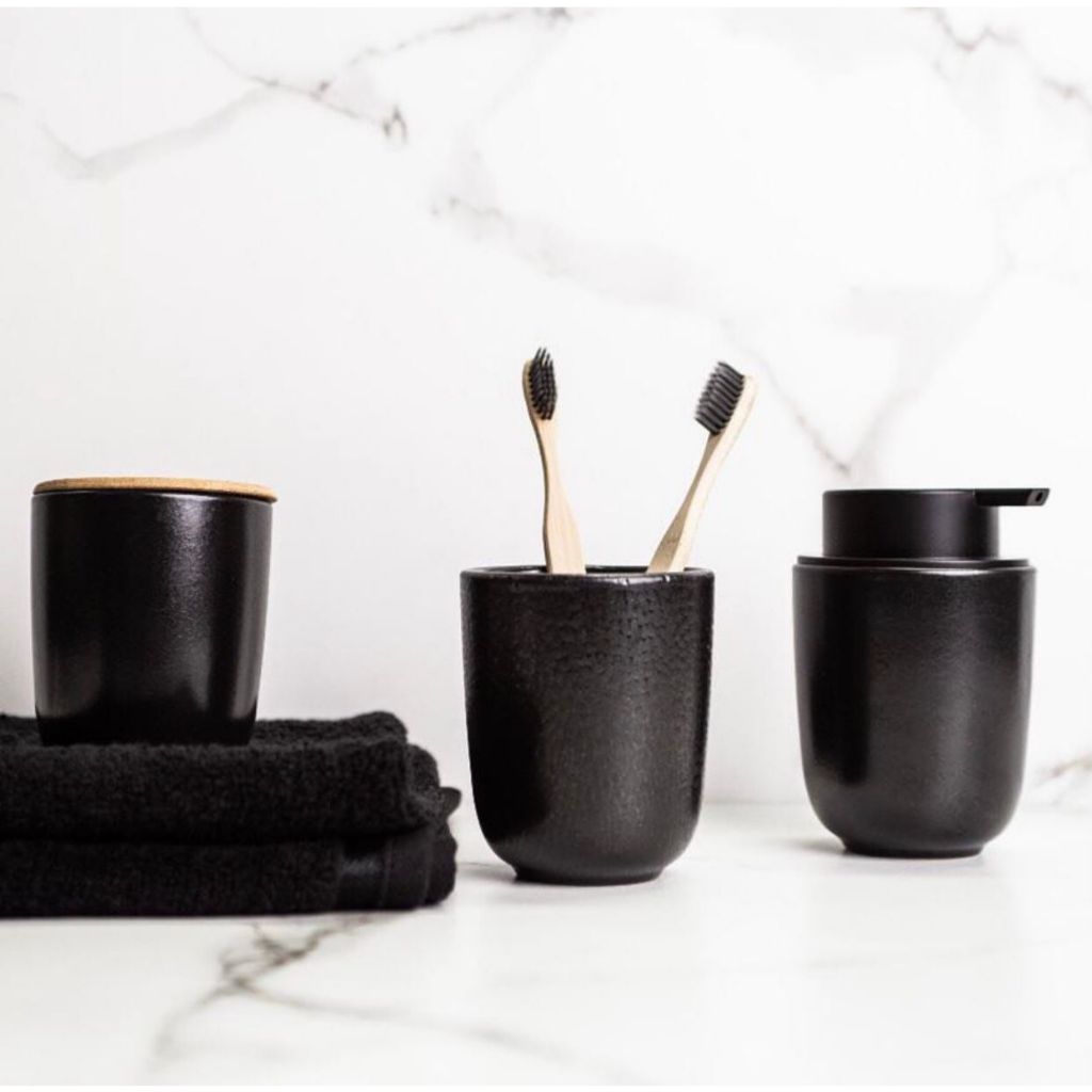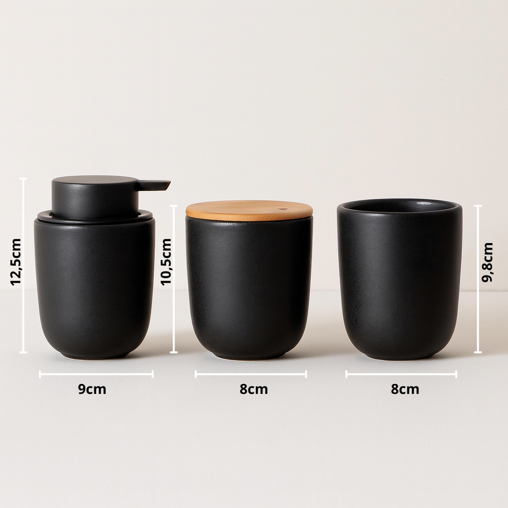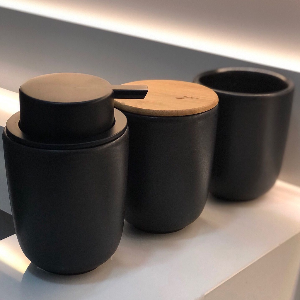 Kit Banheiro Luxo Cerâmica Preto Tampa de Bambu | Porta Sabonete Líquido Porta Escova Pote Lavabo