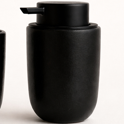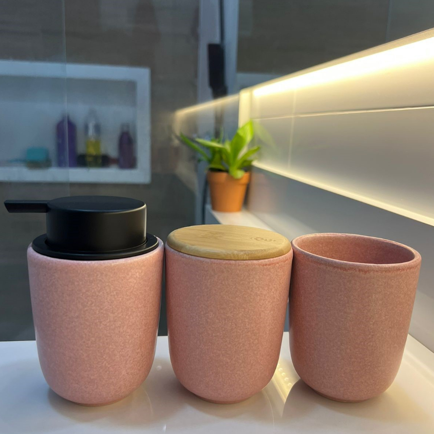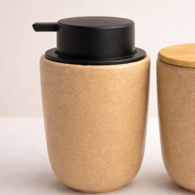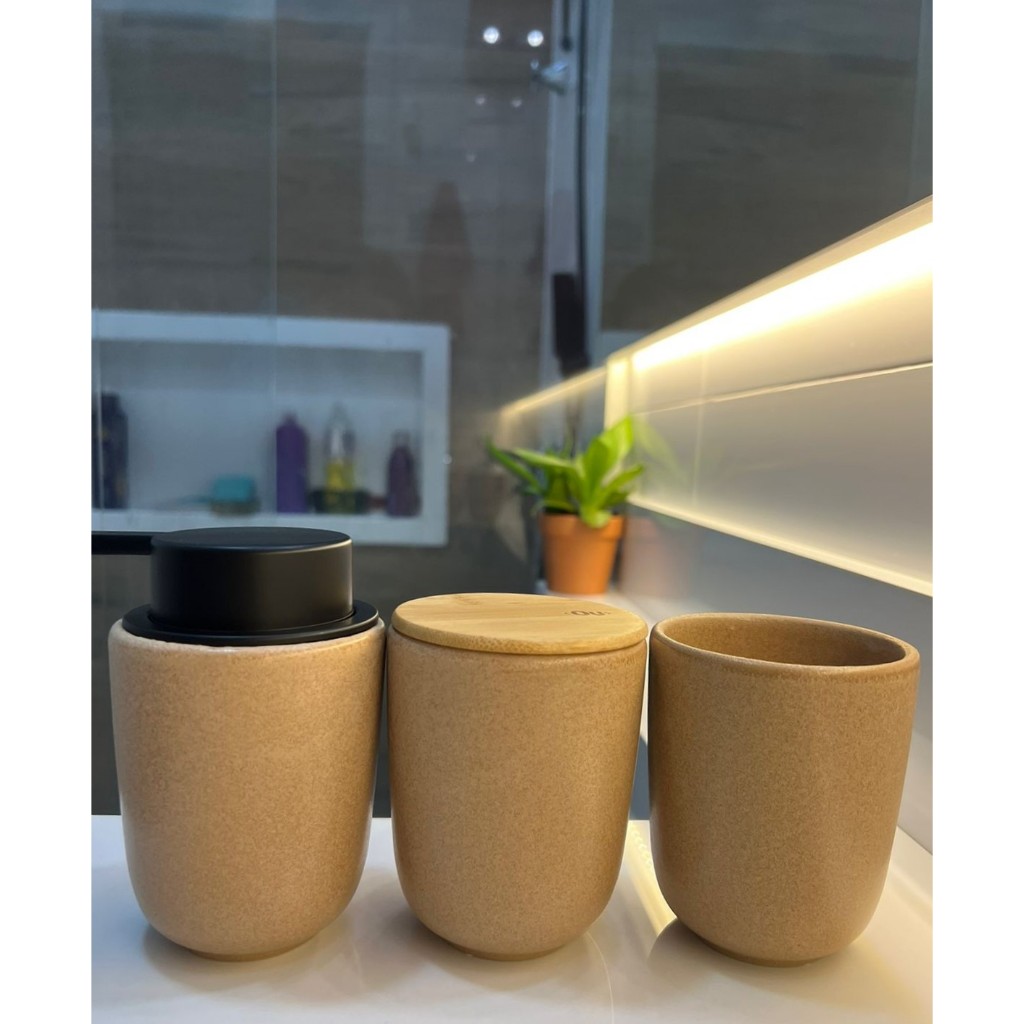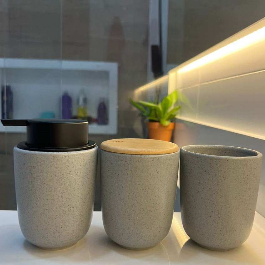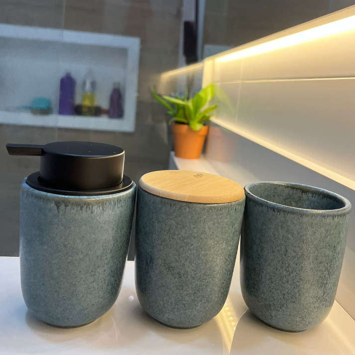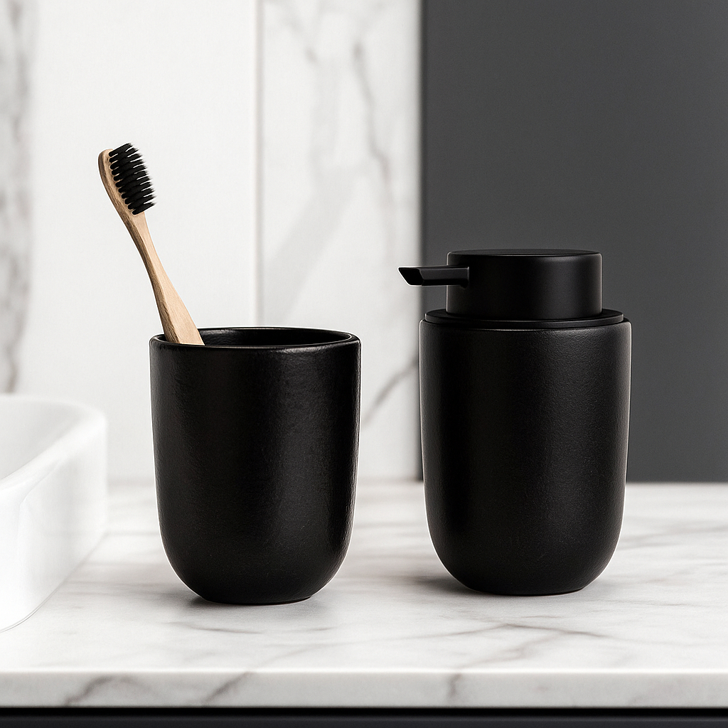 Kit Banheiro Luxo Cerâmica Preto Tampa de Bambu | Porta Sabonete Líquido Porta Escova Pote Lavabo