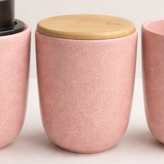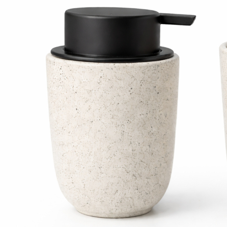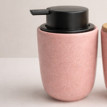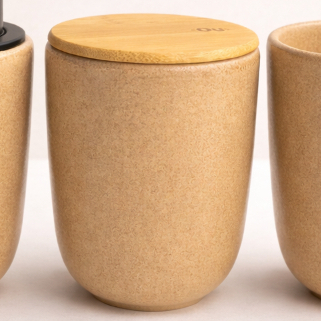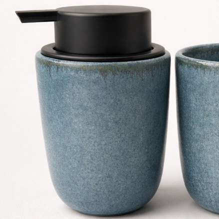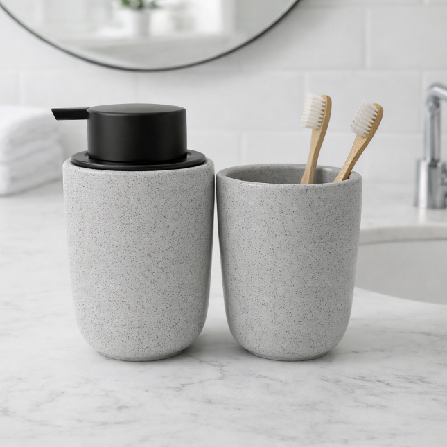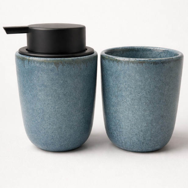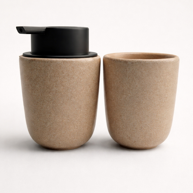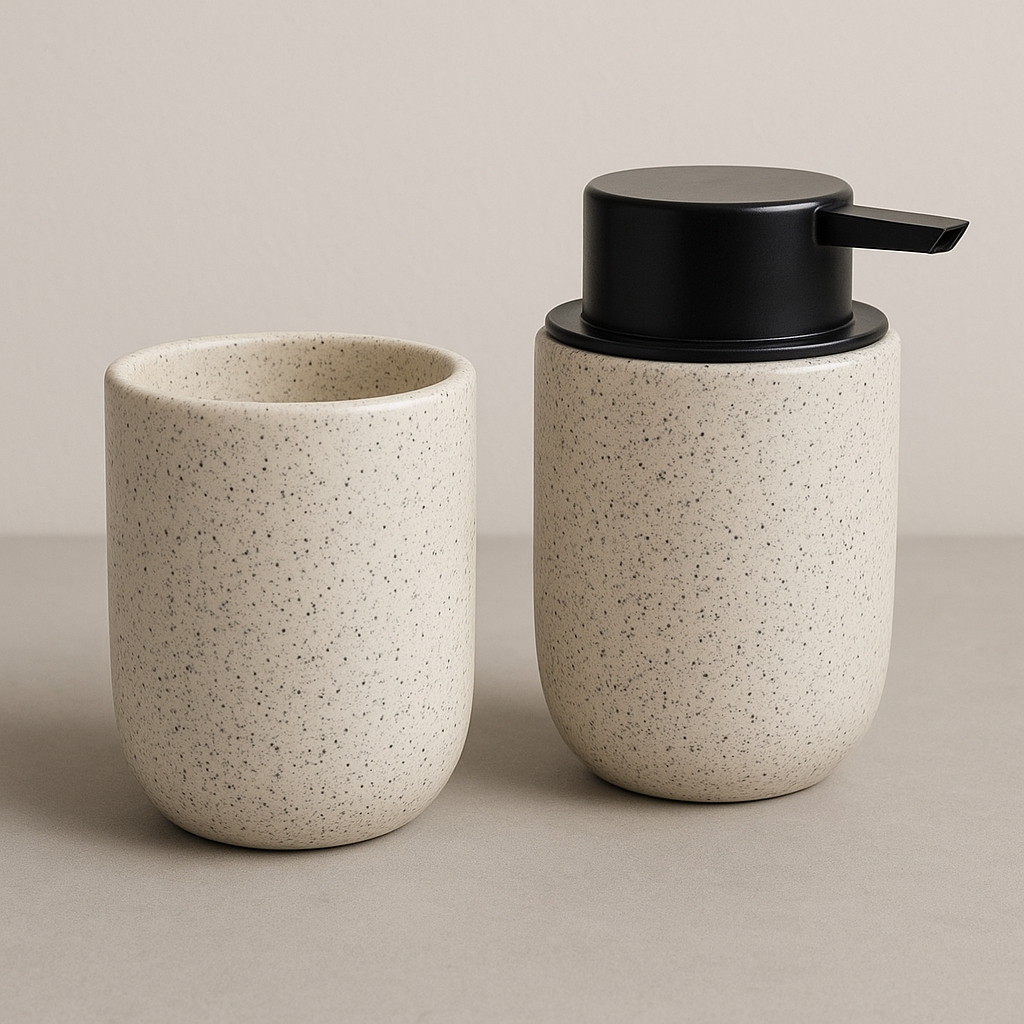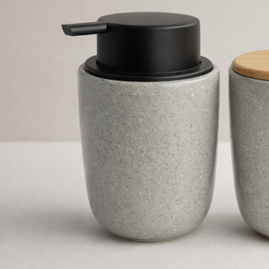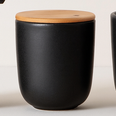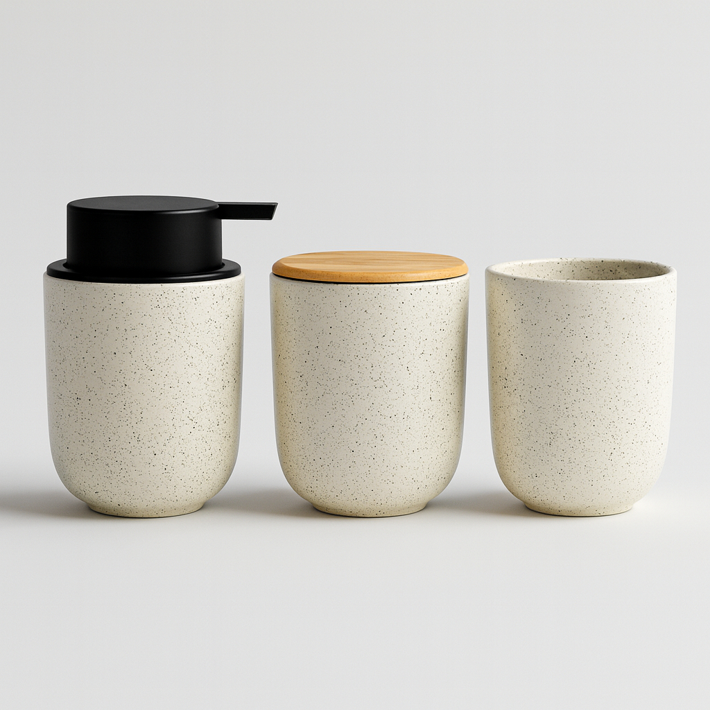 Kit Banheiro Luxo Cerâmica Preto Tampa de Bambu | Porta Sabonete Líquido Porta Escova Pote Lavabo