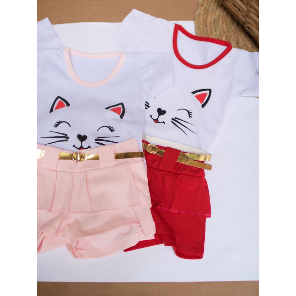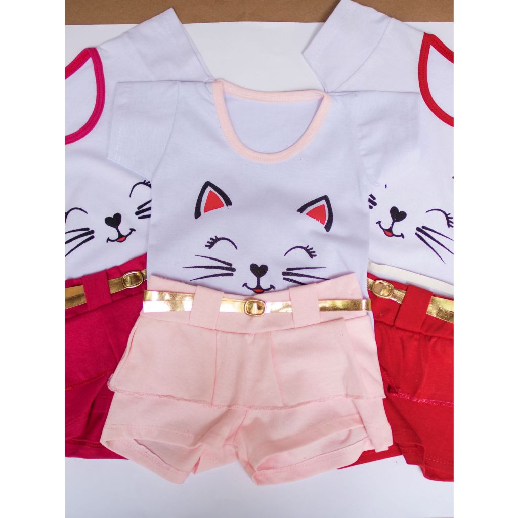 Kit 3 Conjuntos shorts Infantil Baby Menina 6 peças Recém-Nascida Gatinha 0-3 meses