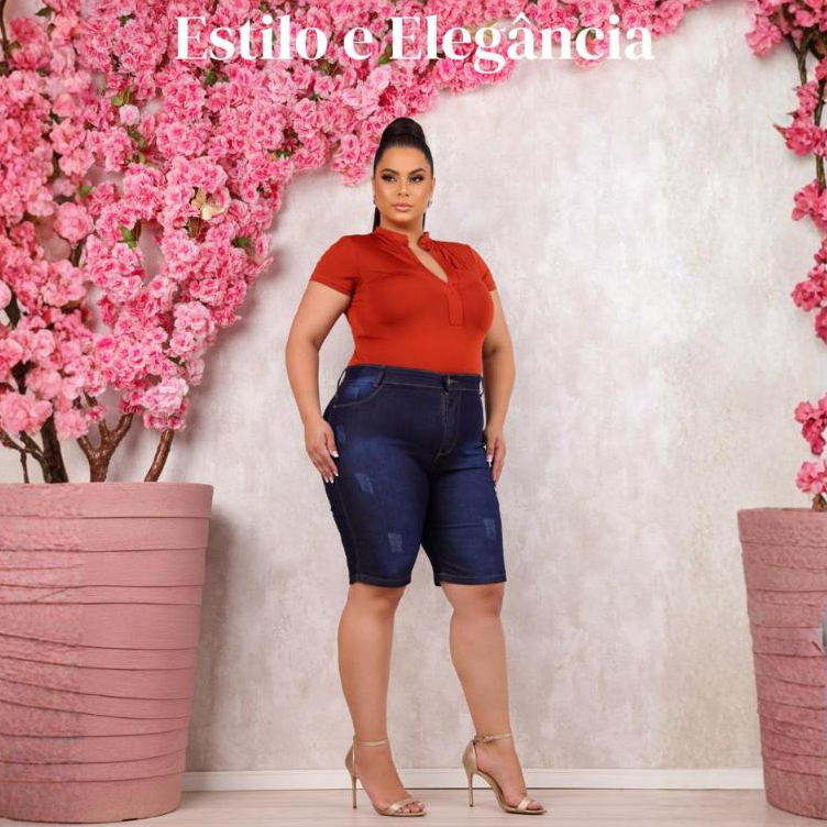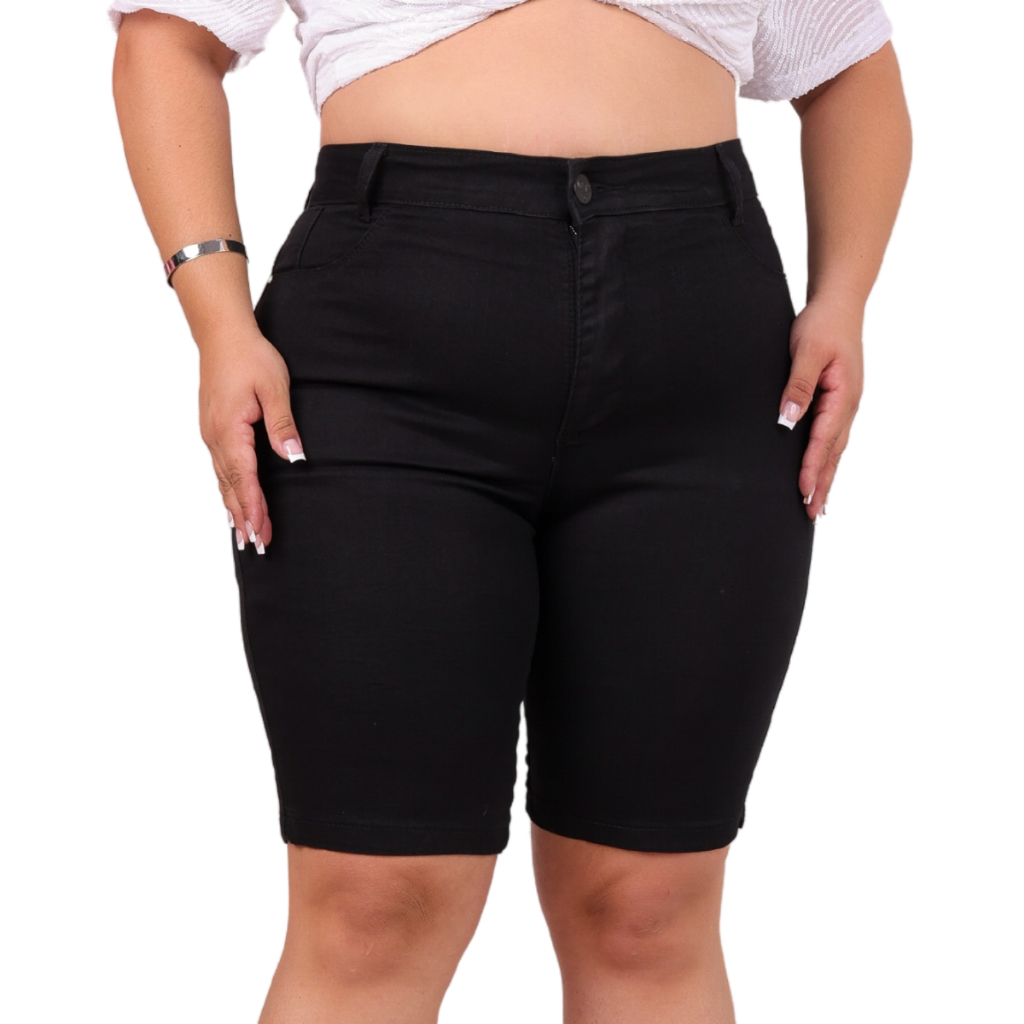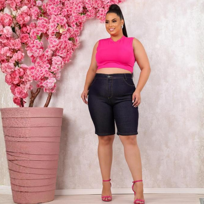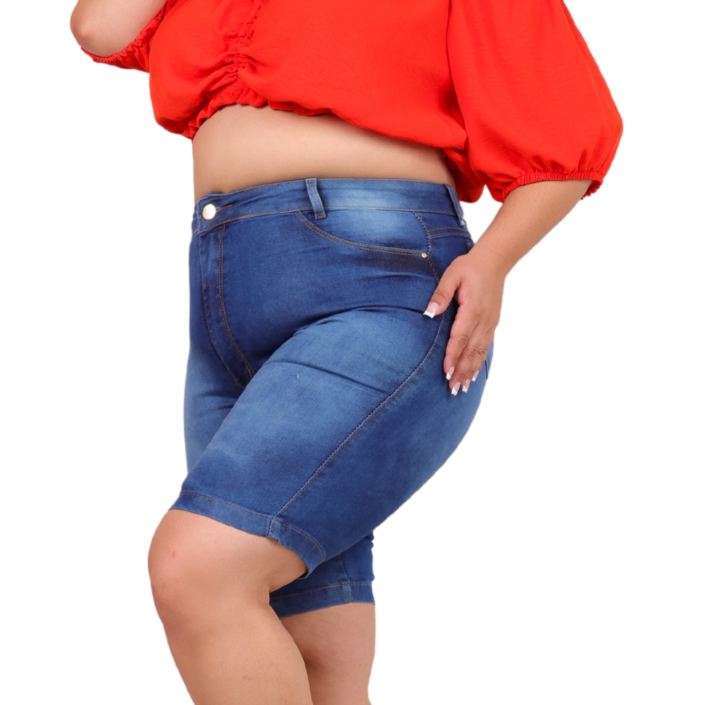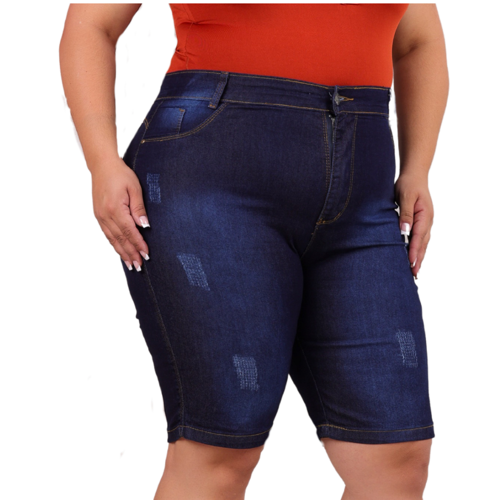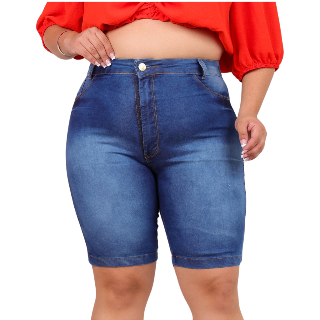 Bermudas Jeans Plus Size Cintura Alta Até o Joelho Elastano