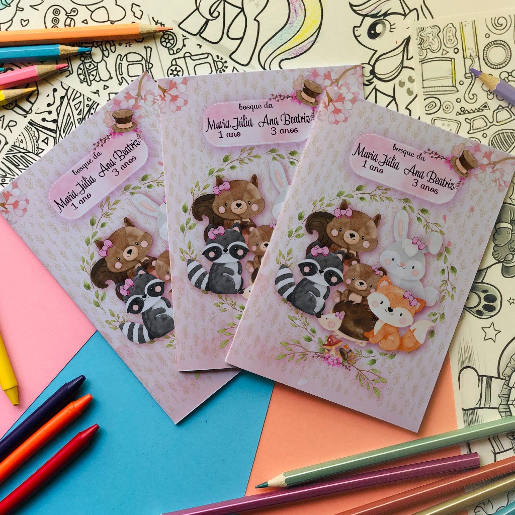 Revistinha de colorir no tema Bosque rosa para festa de aniversário e lembrancinhas A6 10x15 cm.