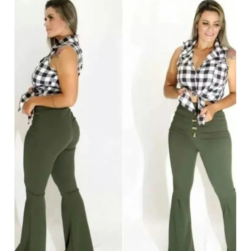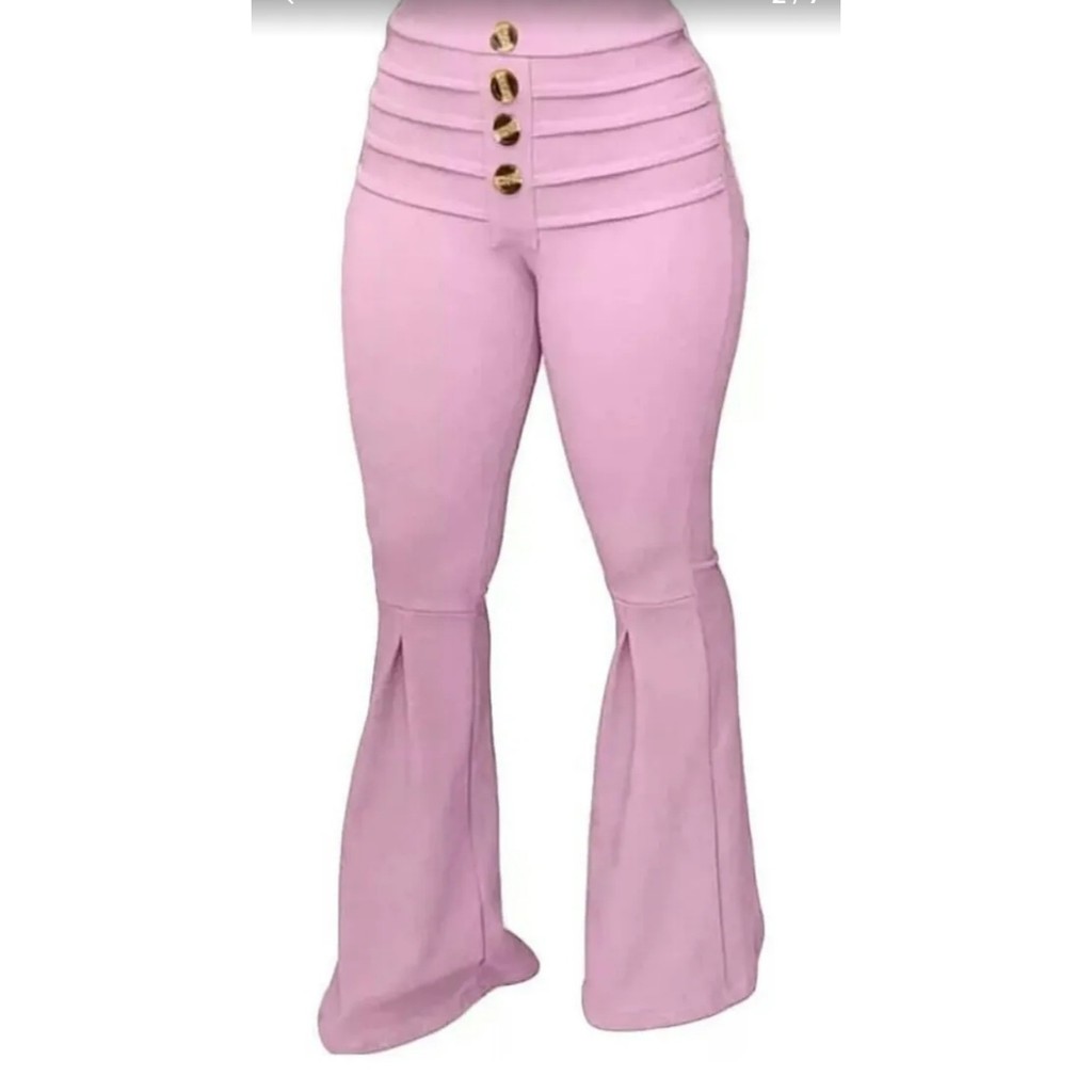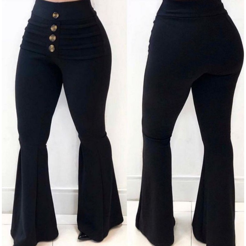 Calça Flare Feminina Cintura Alta Roupa Elásticidade Alta Calças Boca Sino Modeladora Casual Botões Fake Lycra Moda