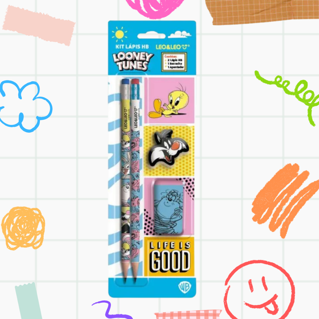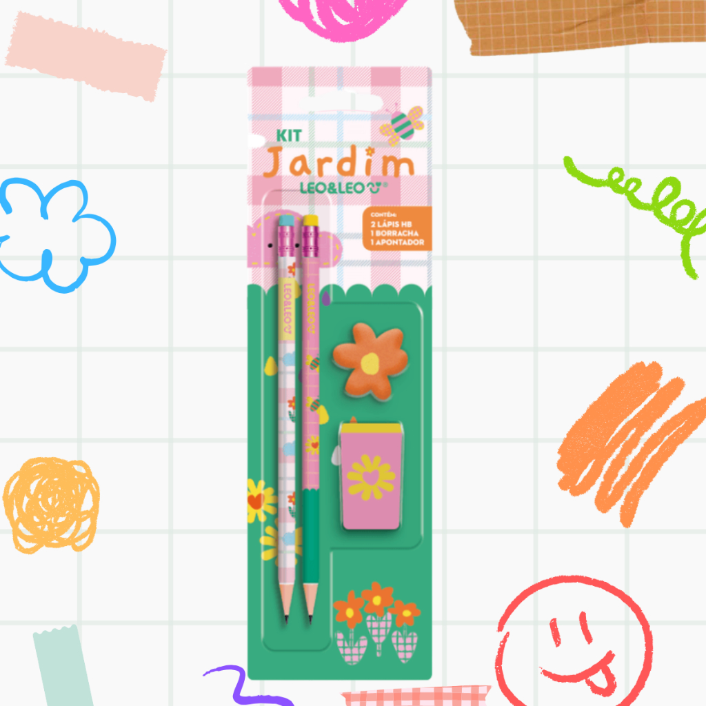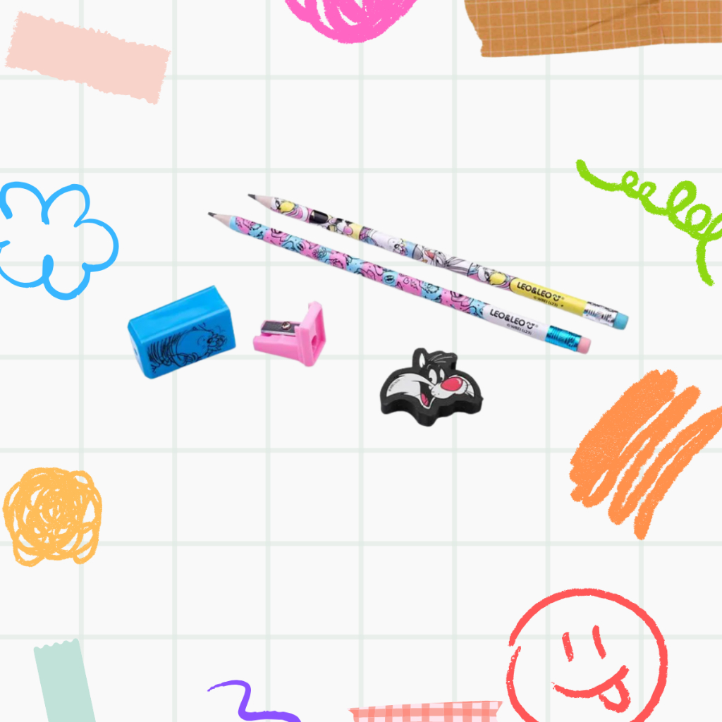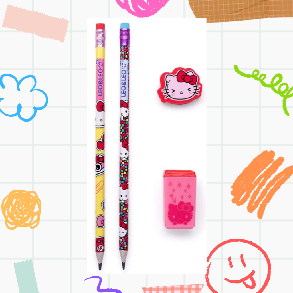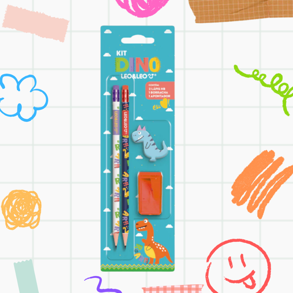 Material Escolar 2 Lapis + Apontador + Borracha Brinde Professor Kit Escolar Fofo Dino Hello Kitty