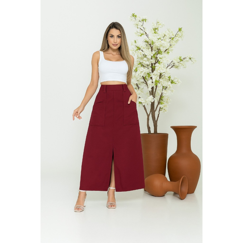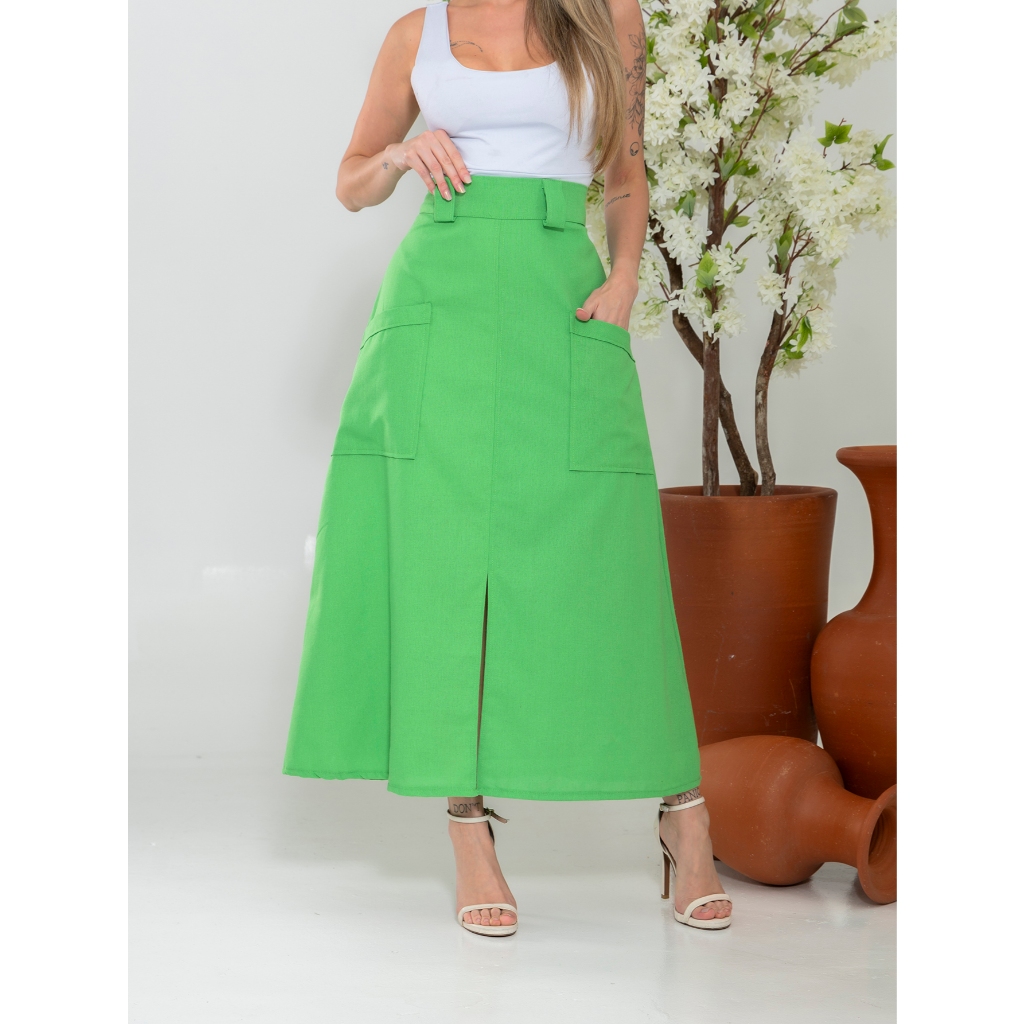 Saia Longa Cintura Alta Linho Forrada Com Bolsos Moda Atual Oferta Hoje
