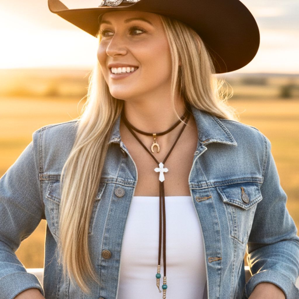 Colar Gravata Country Feminino Bolo Tie Cruz e Ferradura Sertanejo Festa de Peão Rodeio
