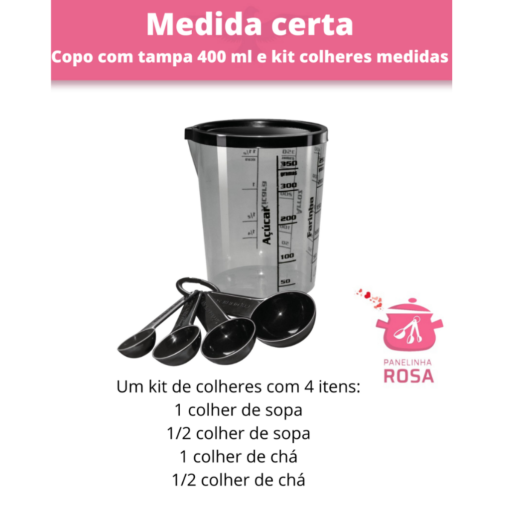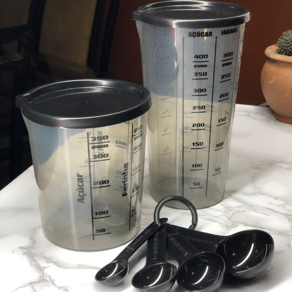 Kit 6 peças conjunto minimalista fume com 2 copos com tampa e colheres medidoras na cor preta