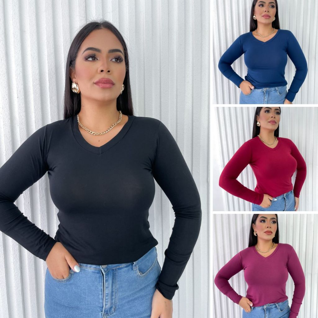 Kit 4 Blusas Femininas Gola V Manga Longa